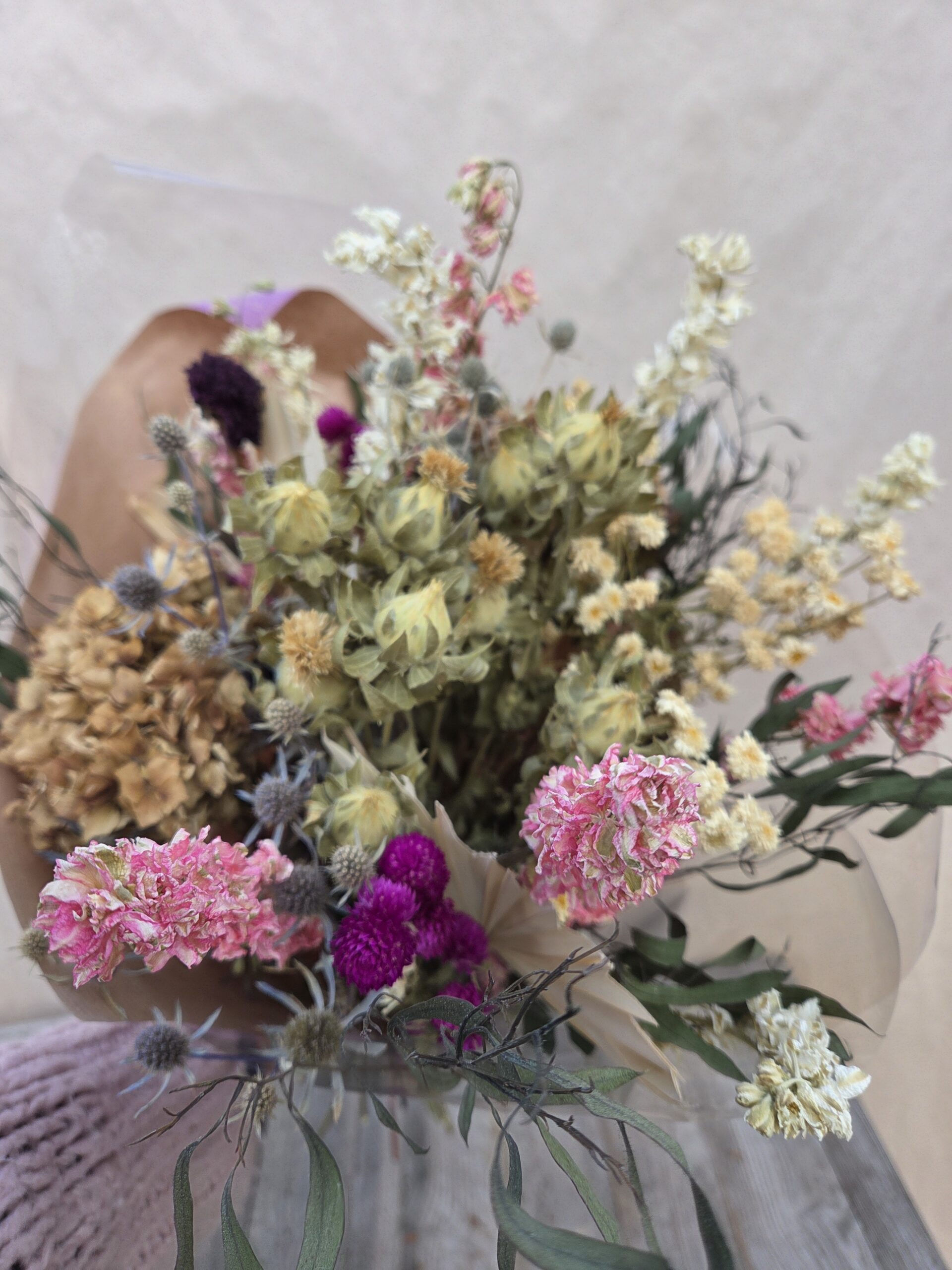 Un superbe bouquet de fleurs séchées Made In Montenay, dans les tons roses et crème.