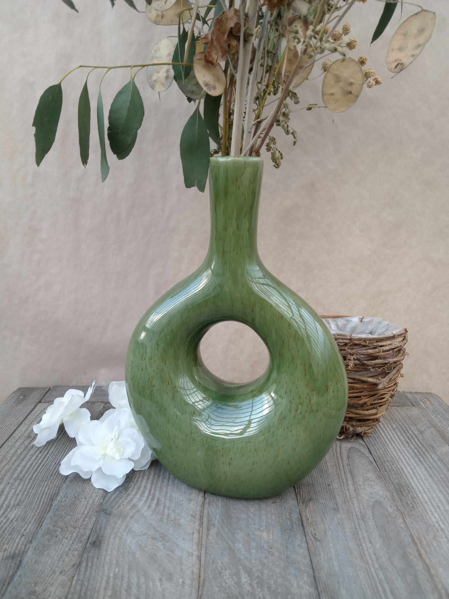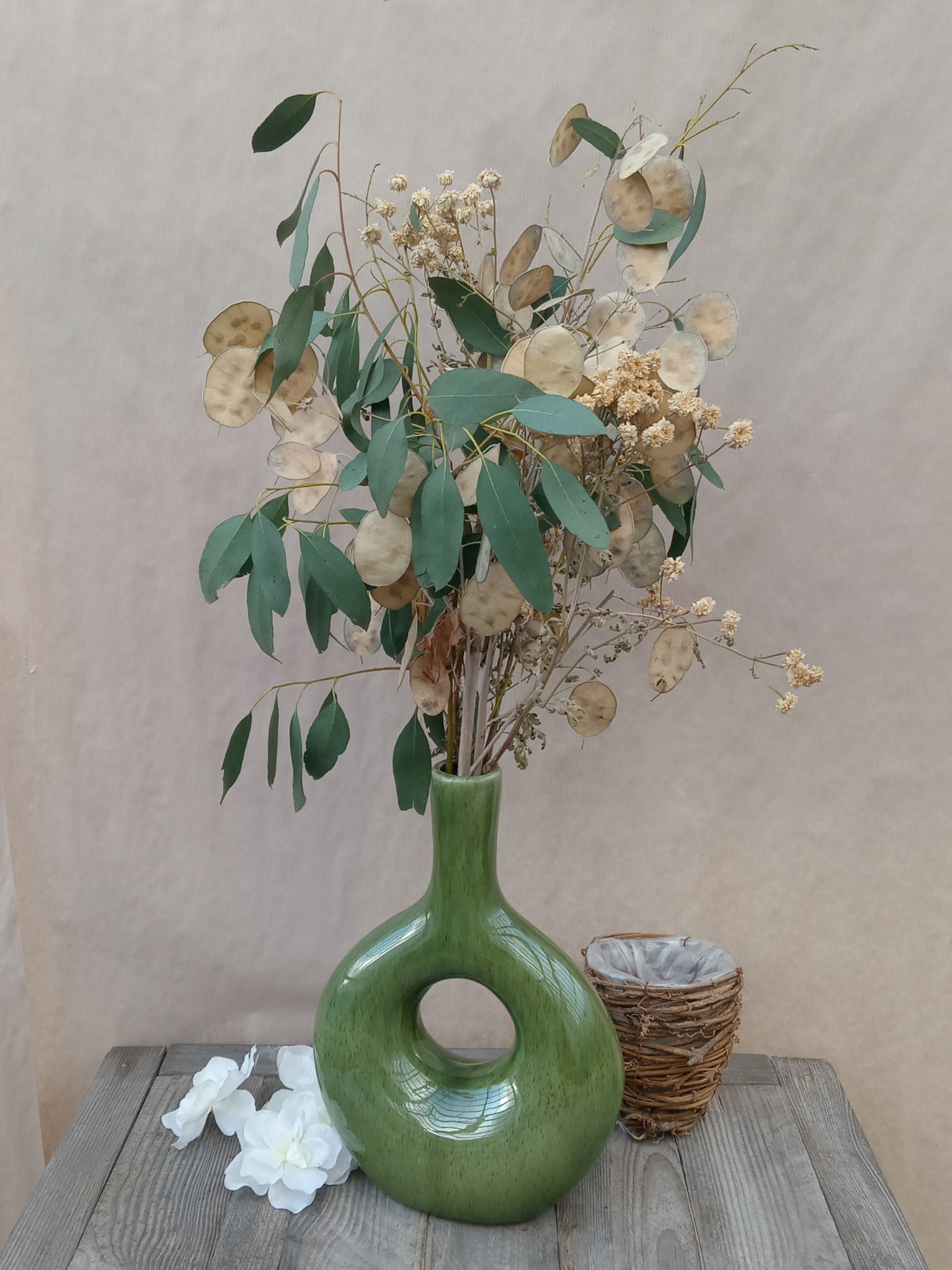 Un très beau bouquet de fleurs séchées dans les tons vert et crème avec un superbe vase vert très tendance.
