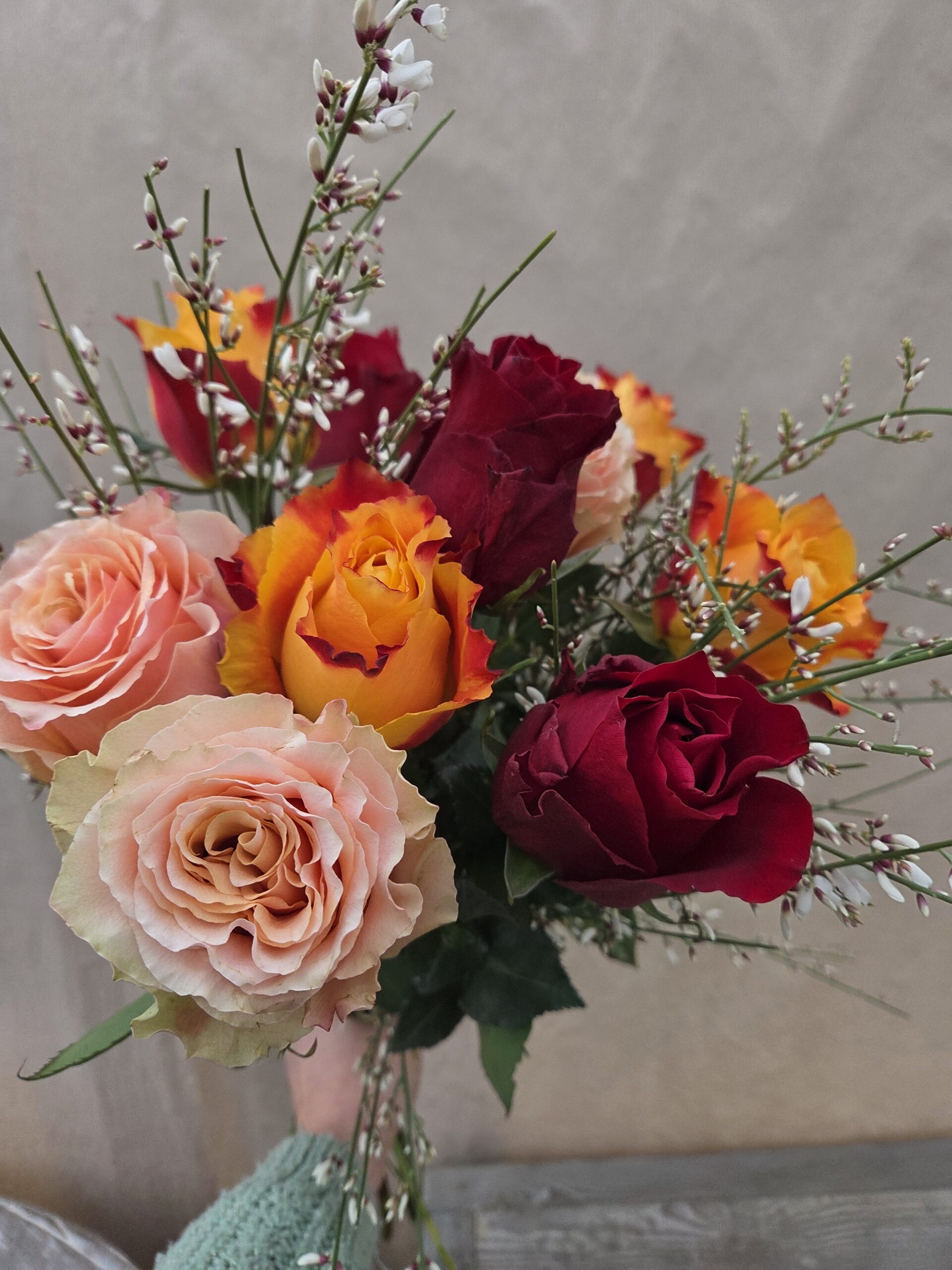 Un très beau bouquet botte de 10 Roses dans les tons roses, rouges et oranges.