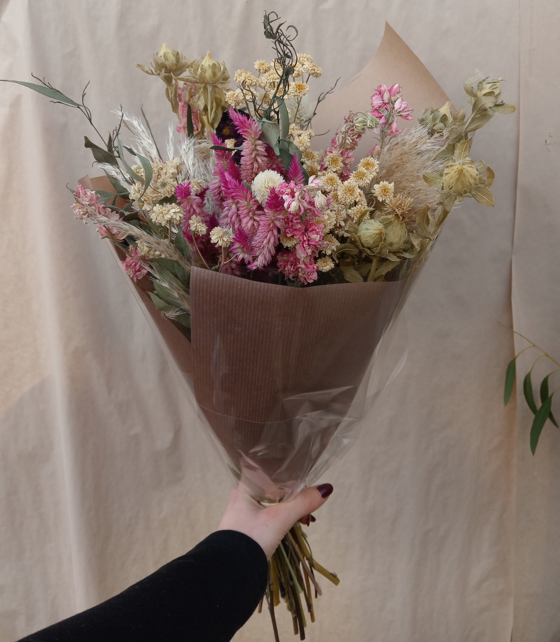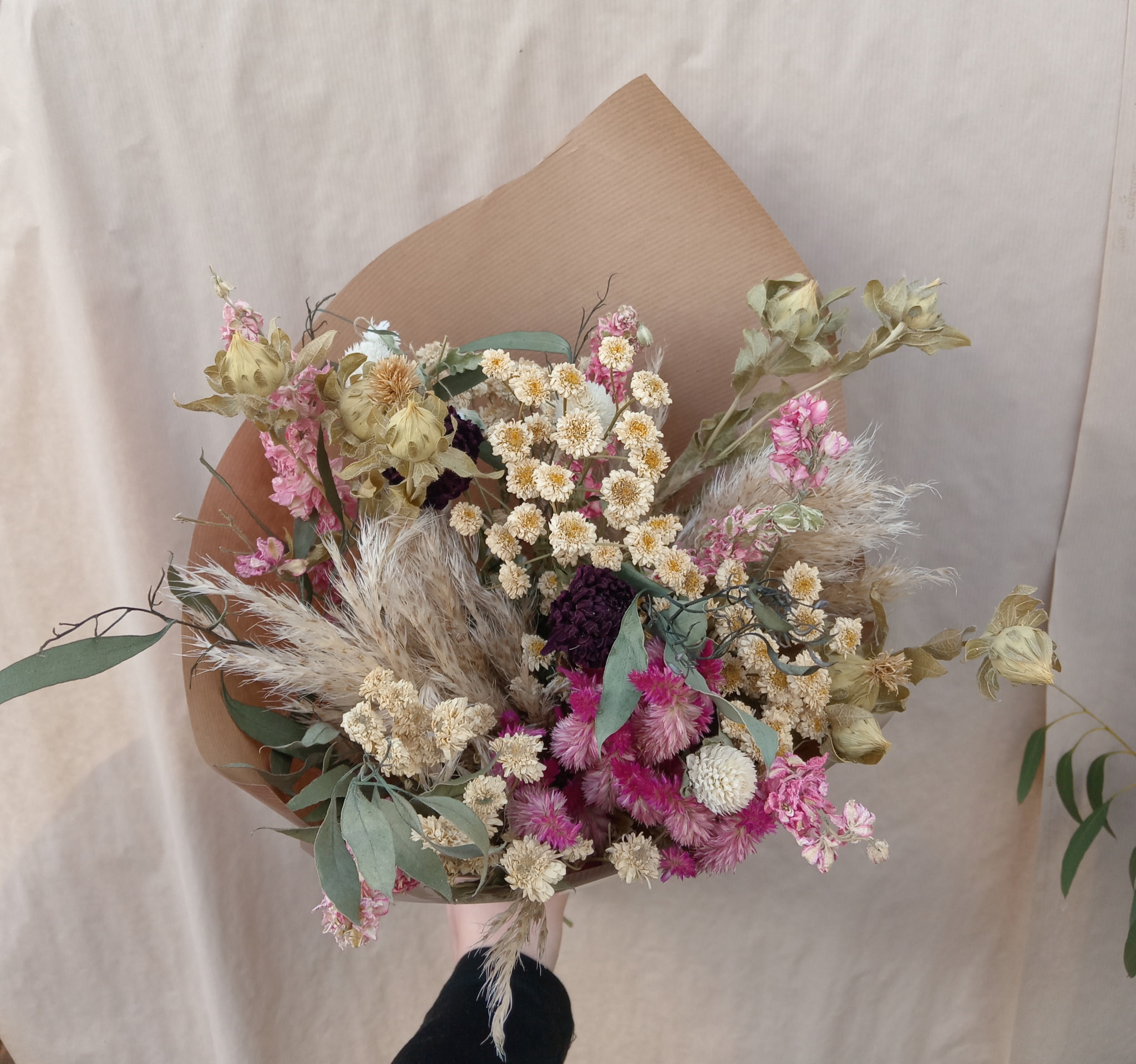 Un très beau beaucoup de fleurs séchées Made In Montenay, dans les tons rose et blanc.
