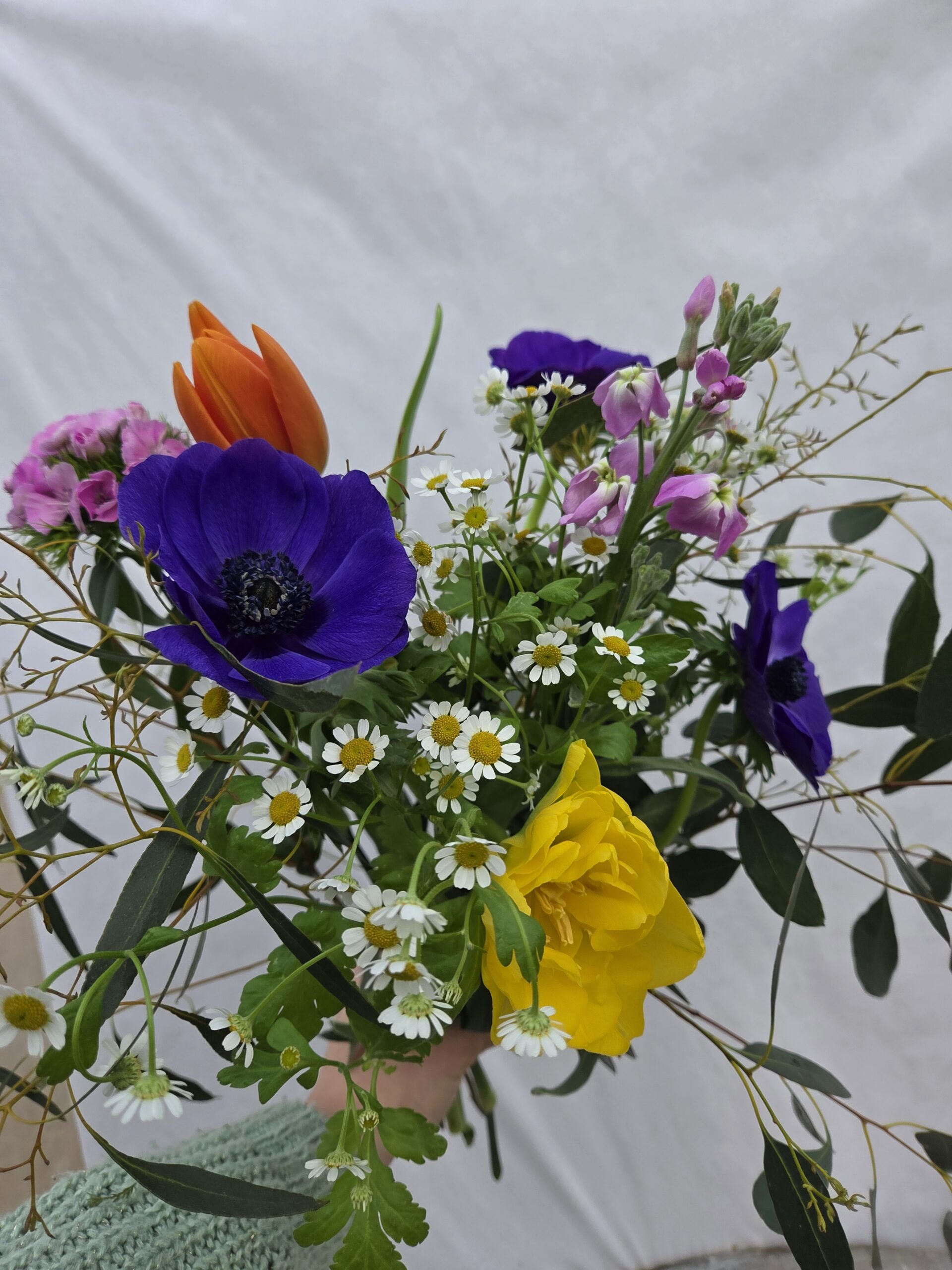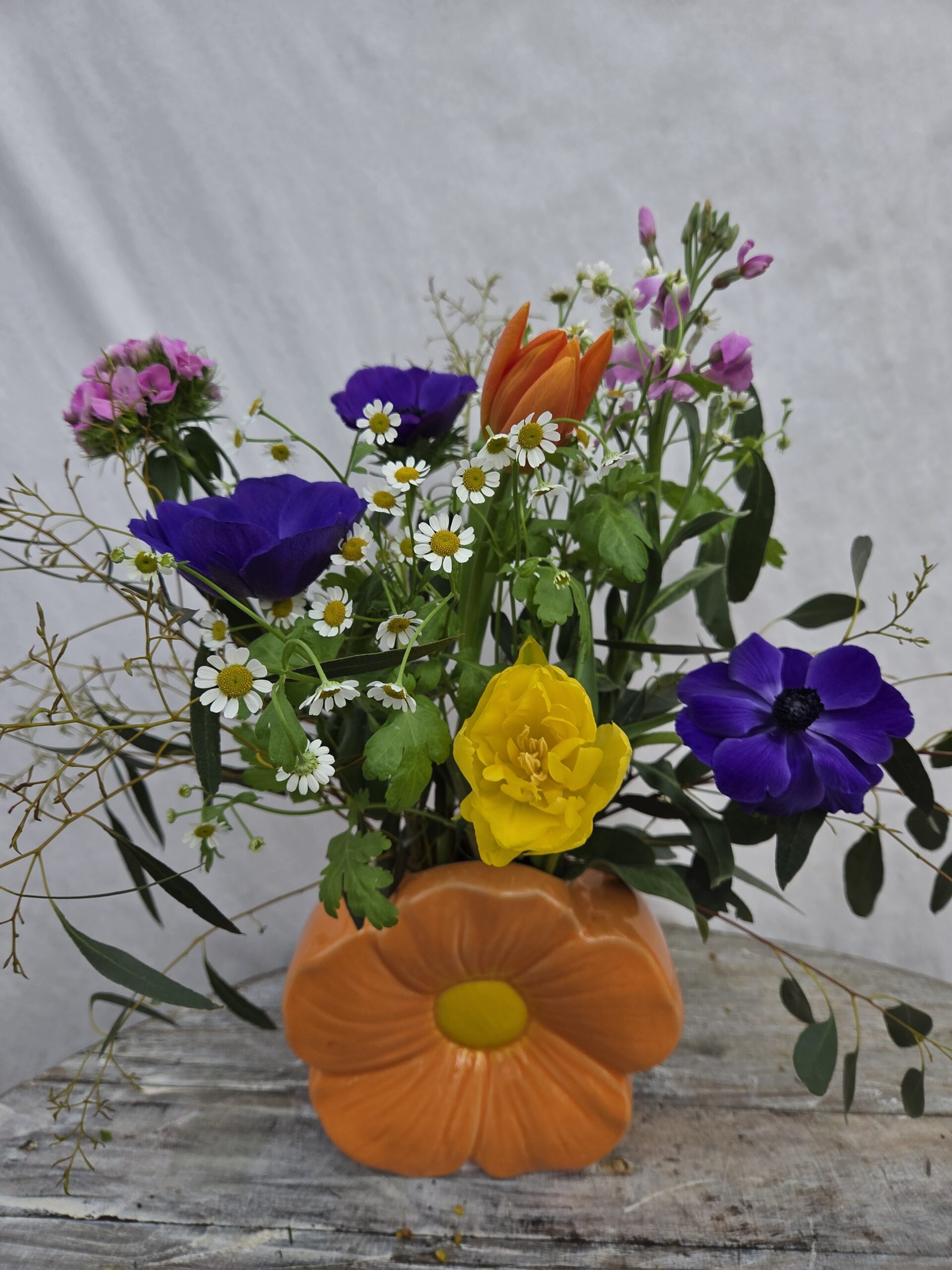 Bouquet composé de fleurs françaises, avec son vase pâquerette.