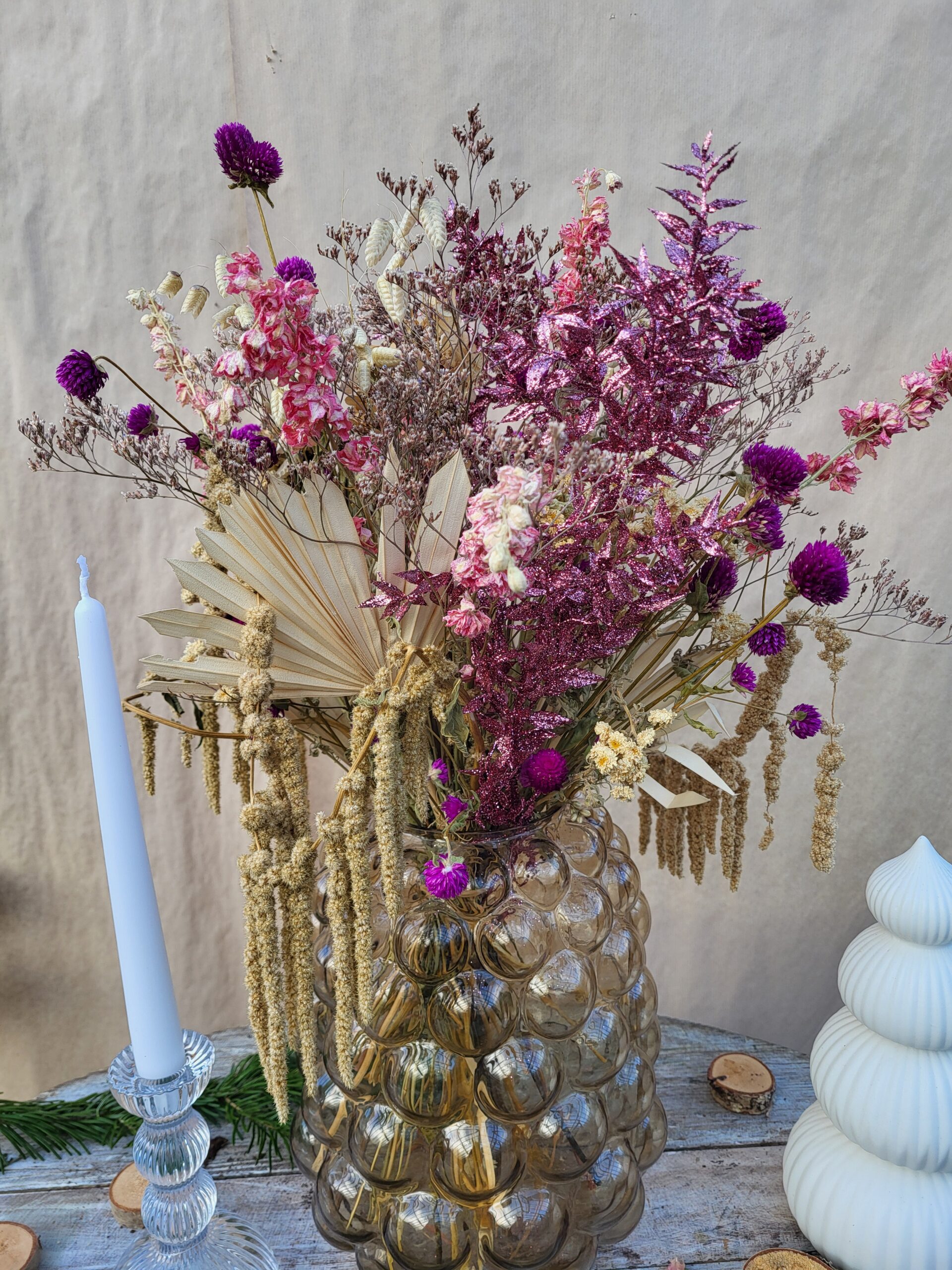 Un bouquet de fleurs séchées françaises, dans les tons automnaux, légèrement retombant. Accompagné par un très beau vase en verre effet bulle.