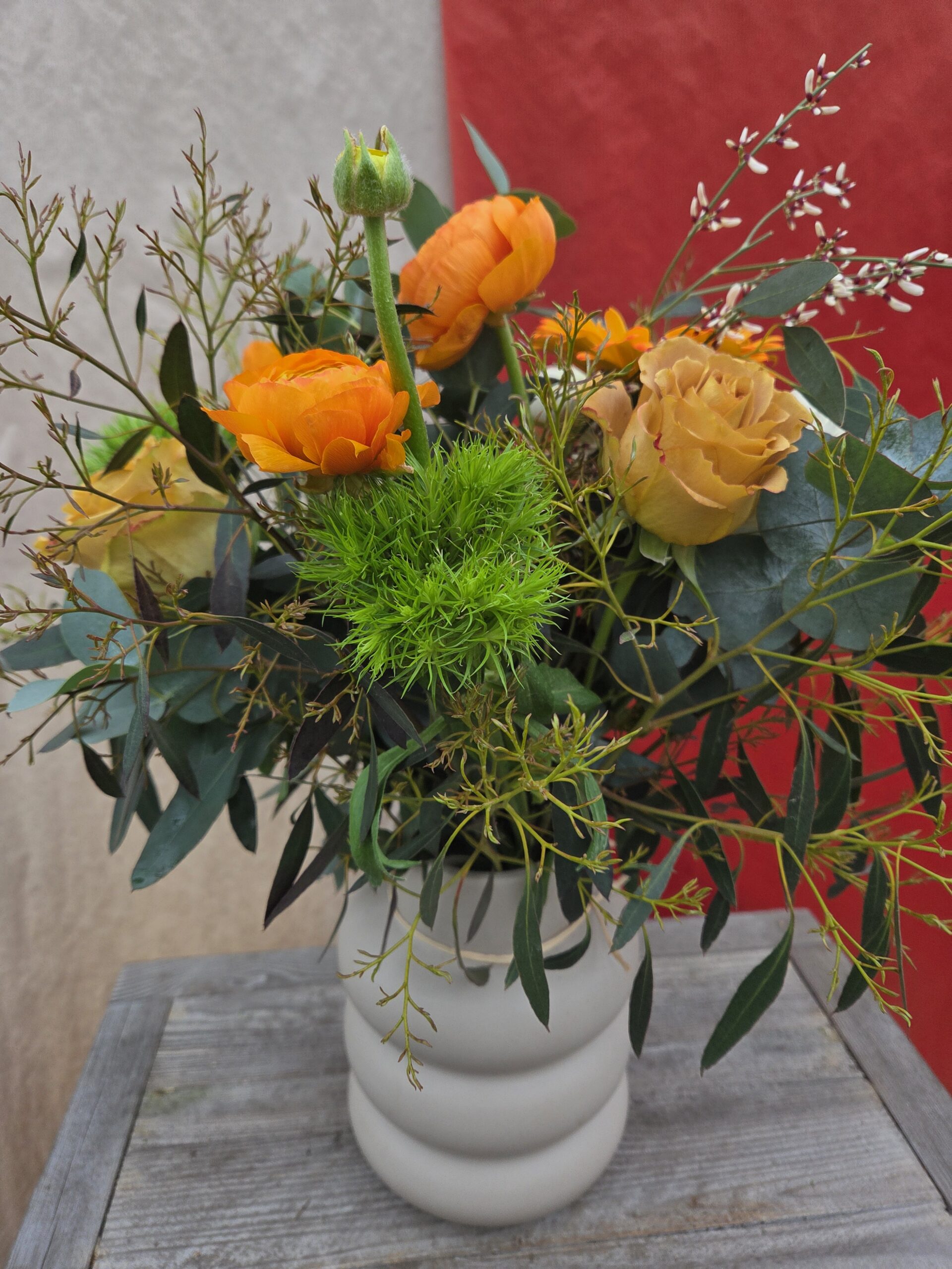 Un ravissant bouquet dans les tons orangé et vert composé de Renoncule et de Roses, d’Oeillet Green, de Gerbera et d’Eucalyptus. Le tout disposé dans un très beau vase gris/taupe.