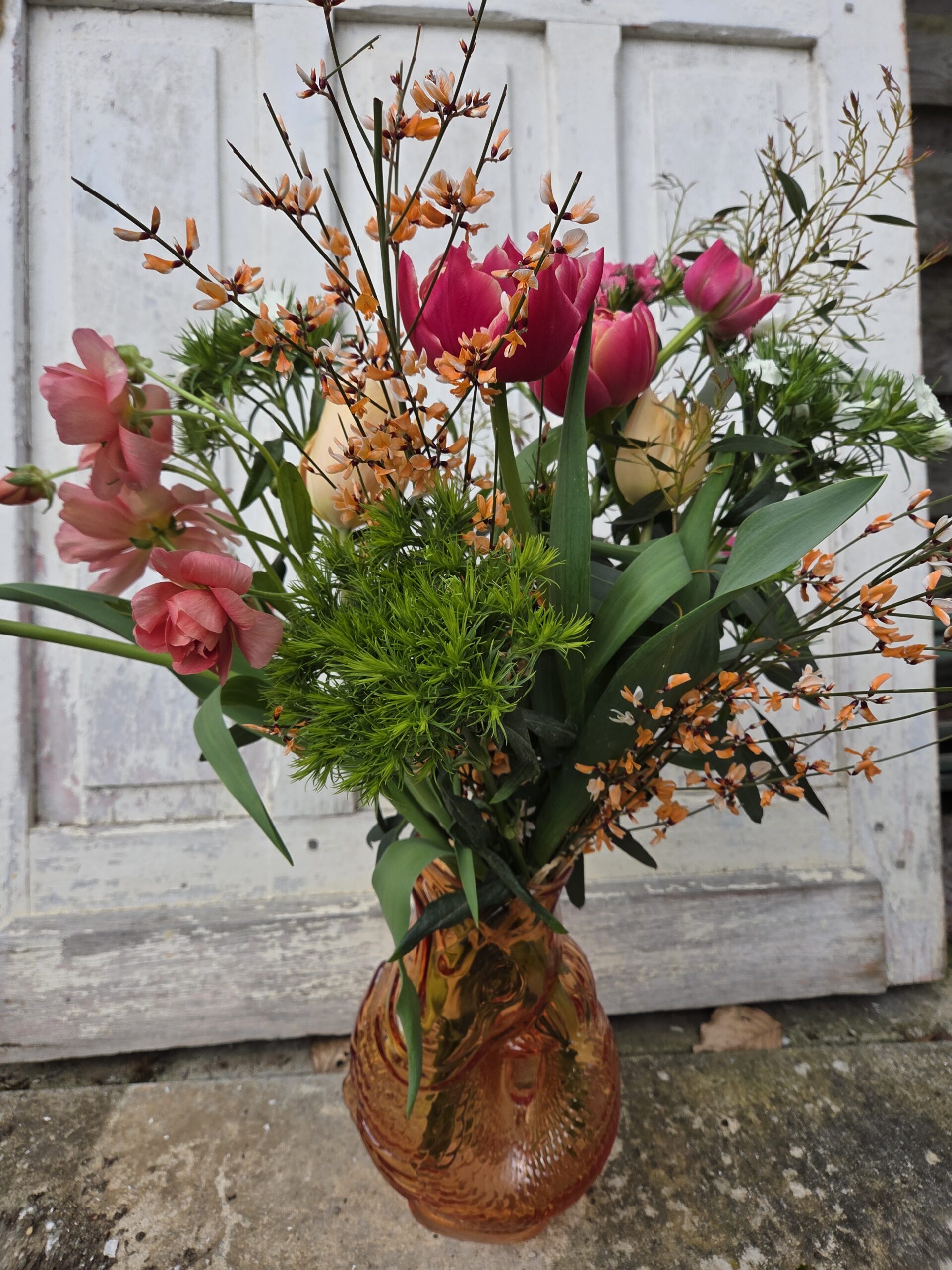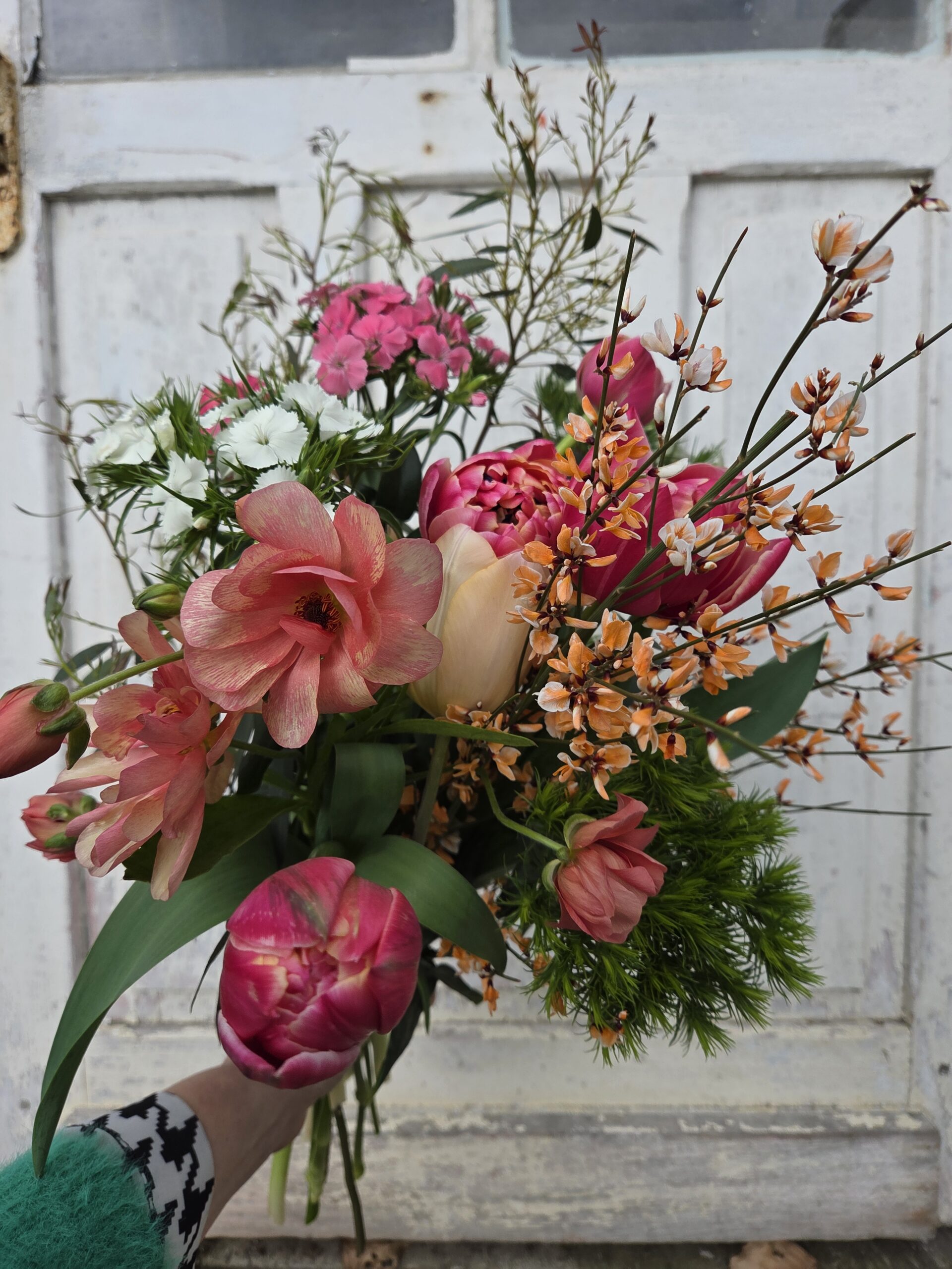 Un bouquet composé de renoncules, tulipes ,oeillet de poète, fleurs poduites localement en Mayenne.
