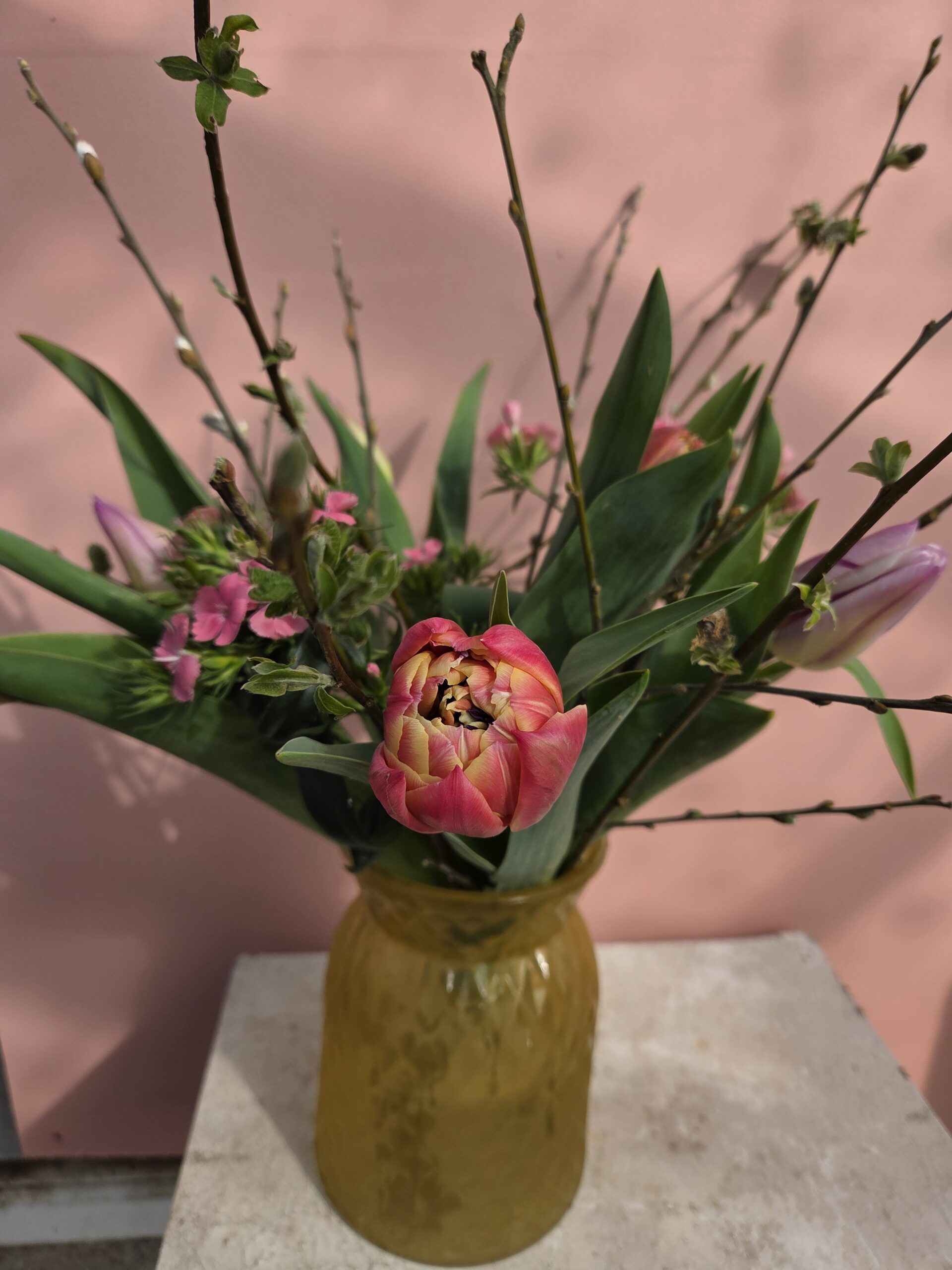 Un bouquet de saison avec son vase jaune, composé de tulipe et oeillet de poète produits à Montenay.