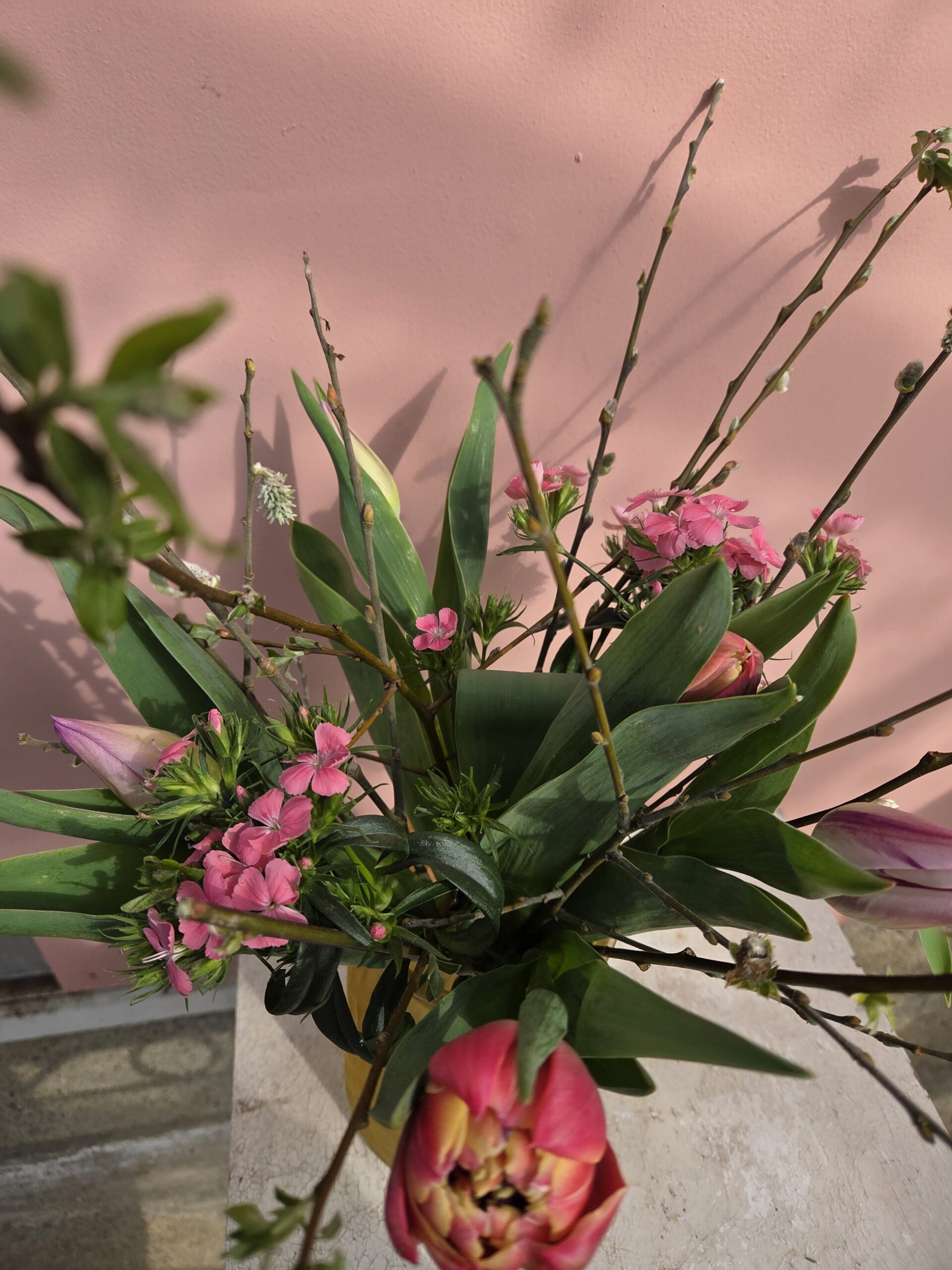 Bouquet de saison avec ses tulipes et oeillet de poète.