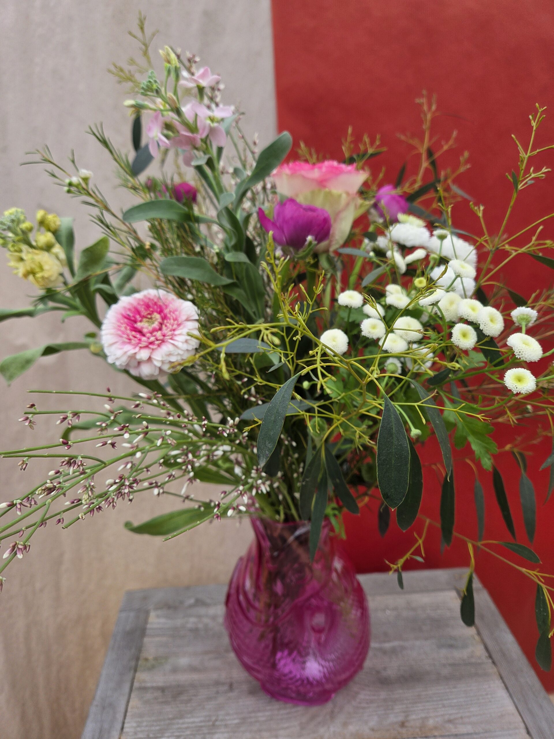 Un très beau bouquet dans les tons roses et blanc, composé de Gemini, de Rose, de Renoncule, de Giroflée, de Matricaire et de Genêt.