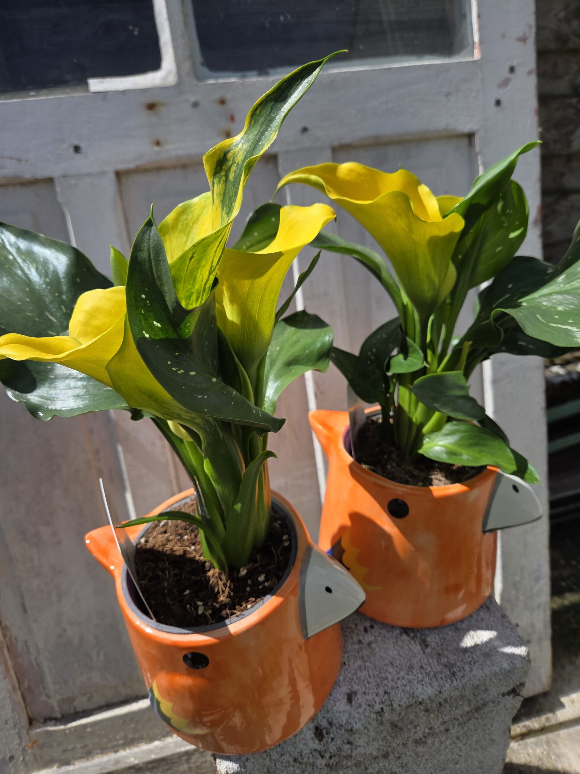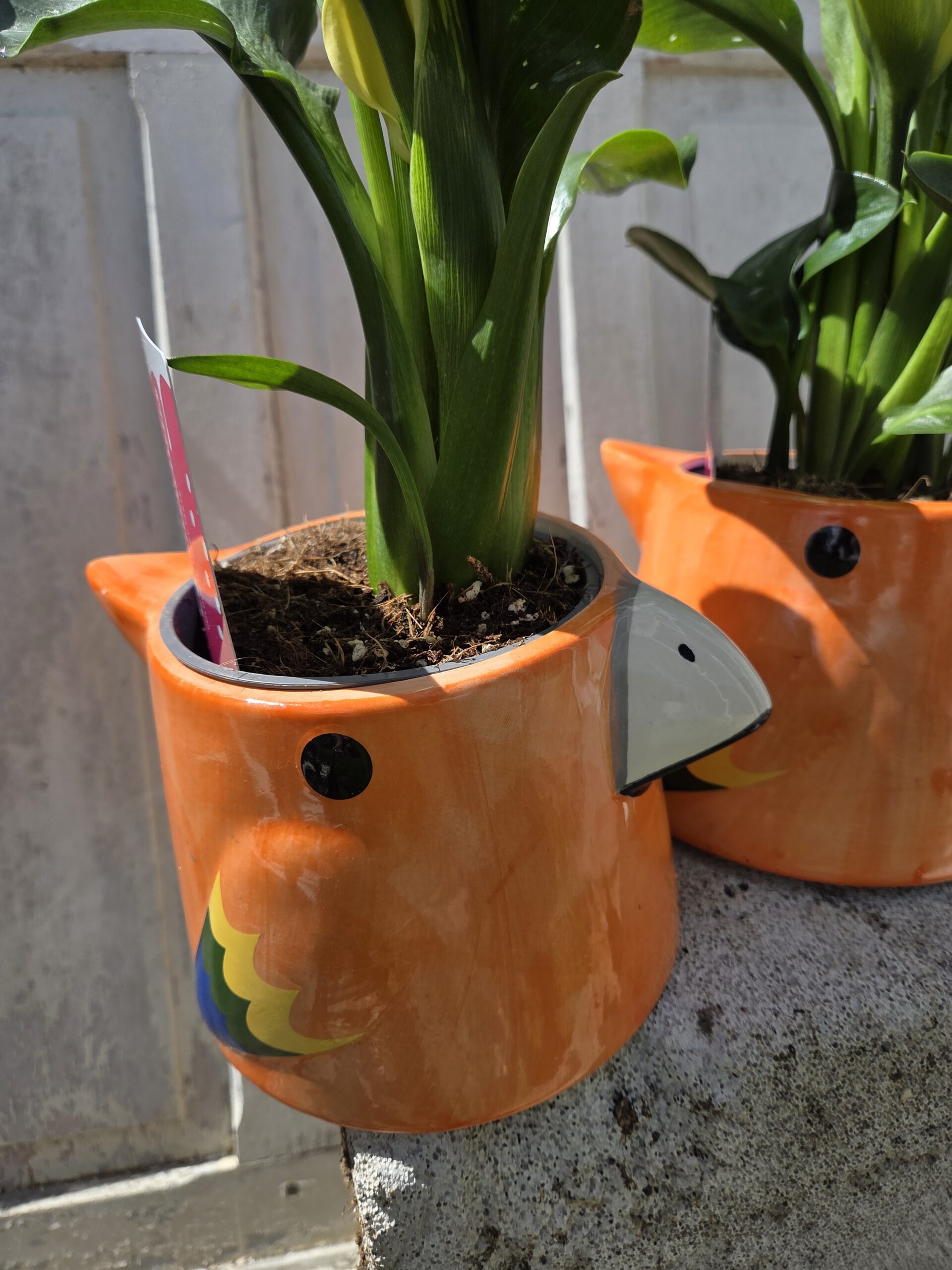 Le calla , arum de couleur, plante à mettre sur une terrasse, fleurit tout l’été; avec son cache pot perroquet.
