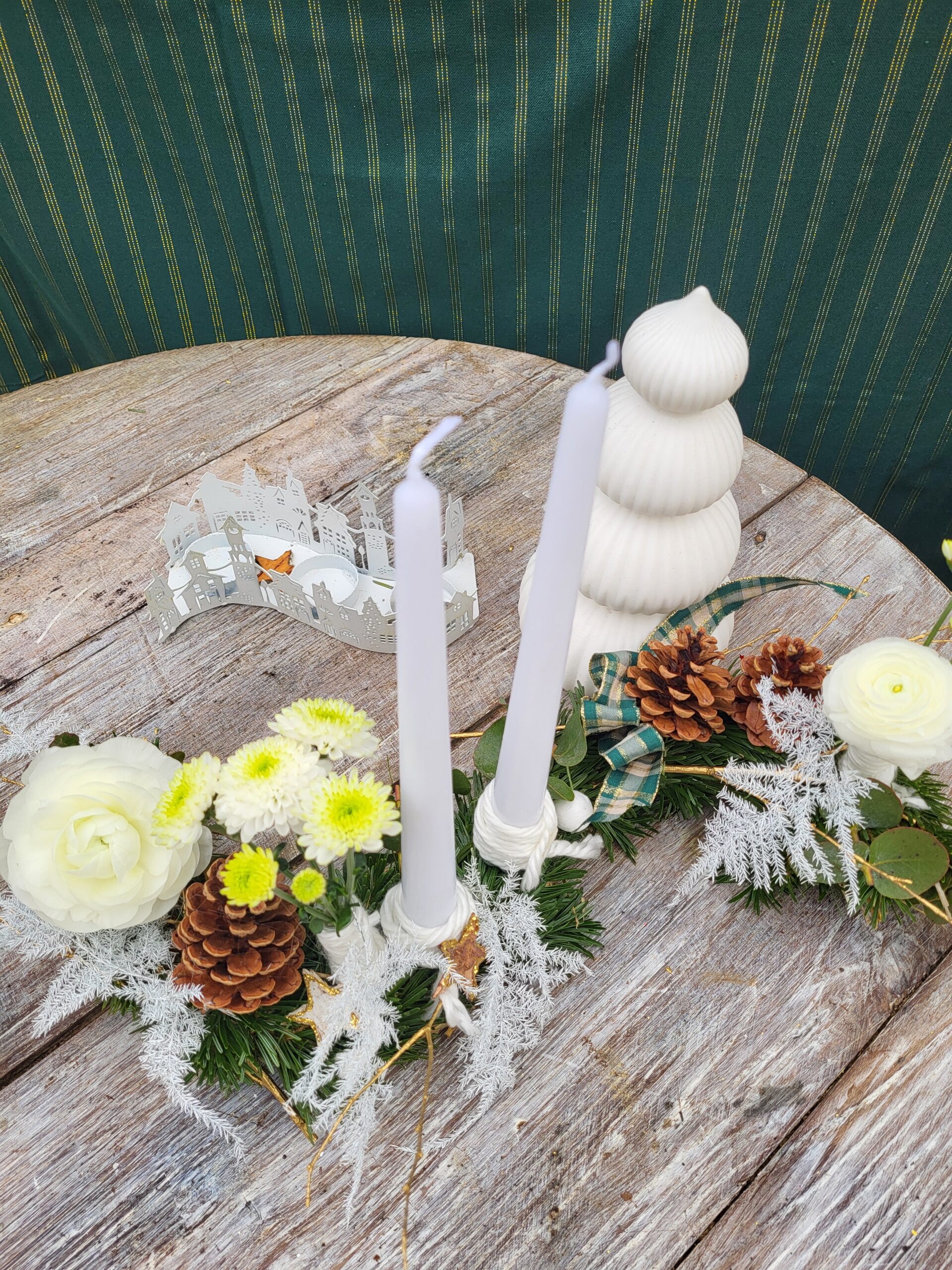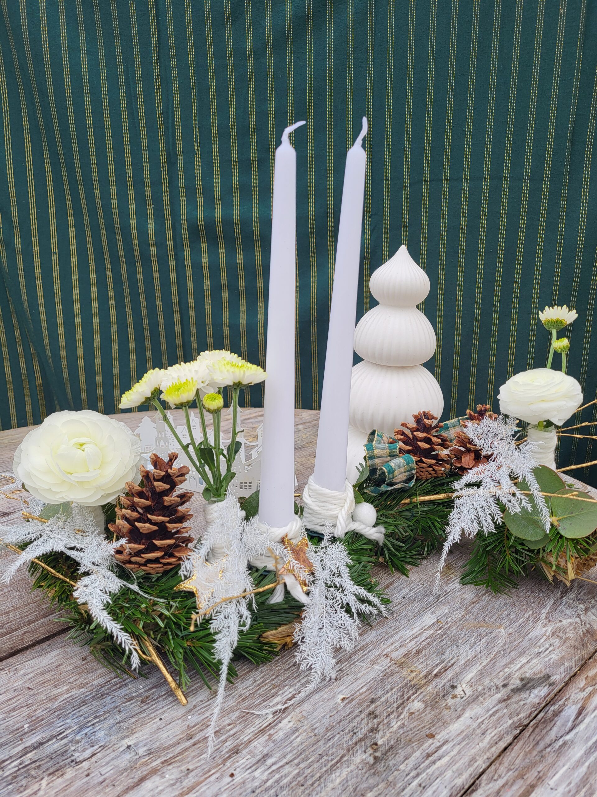Centre de table composé de bougies et fleurs dans les tons blancs.