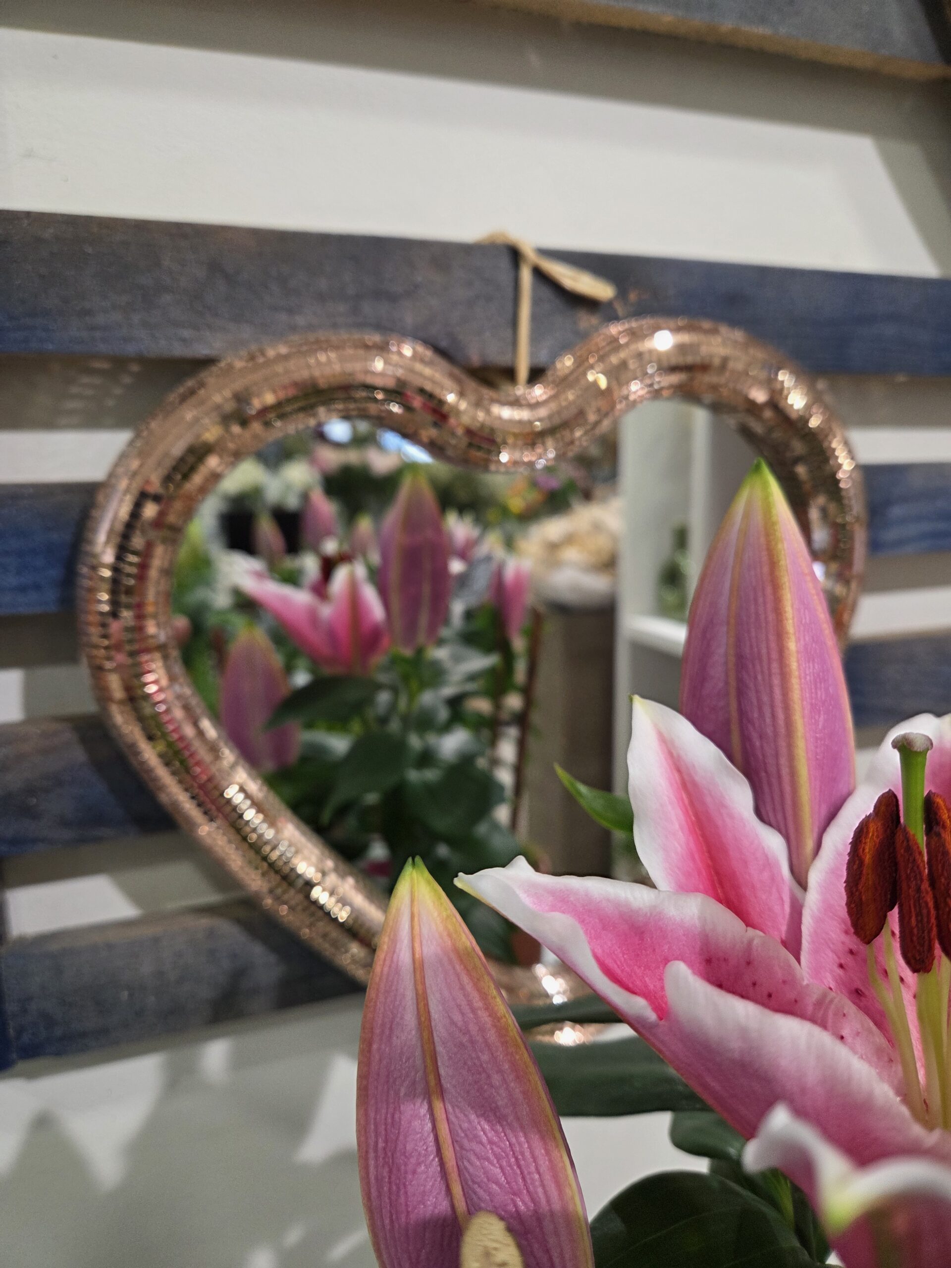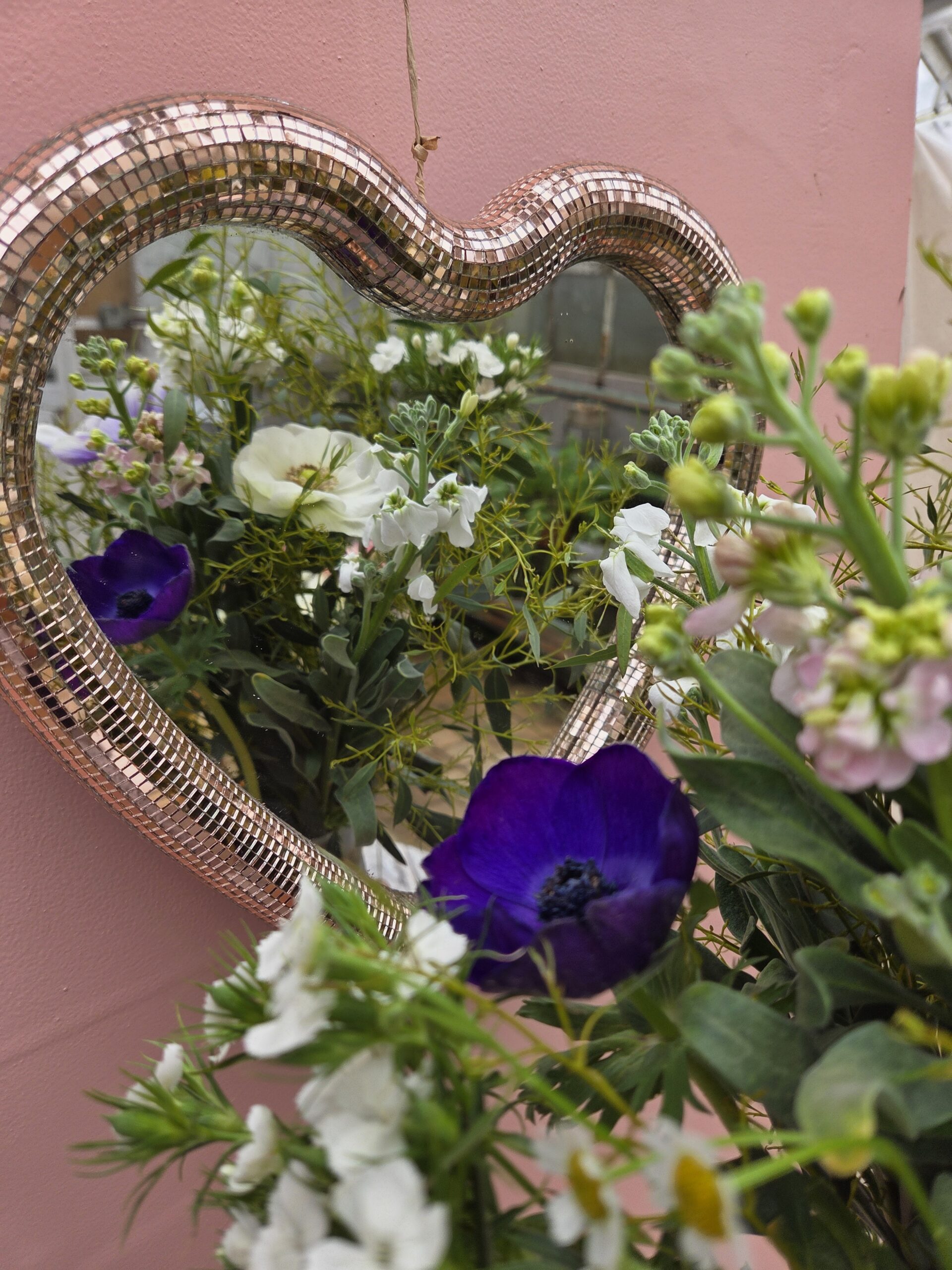 Coeur Miroir composé de petits miroirs rose ornés sur tout le tour du coeur,