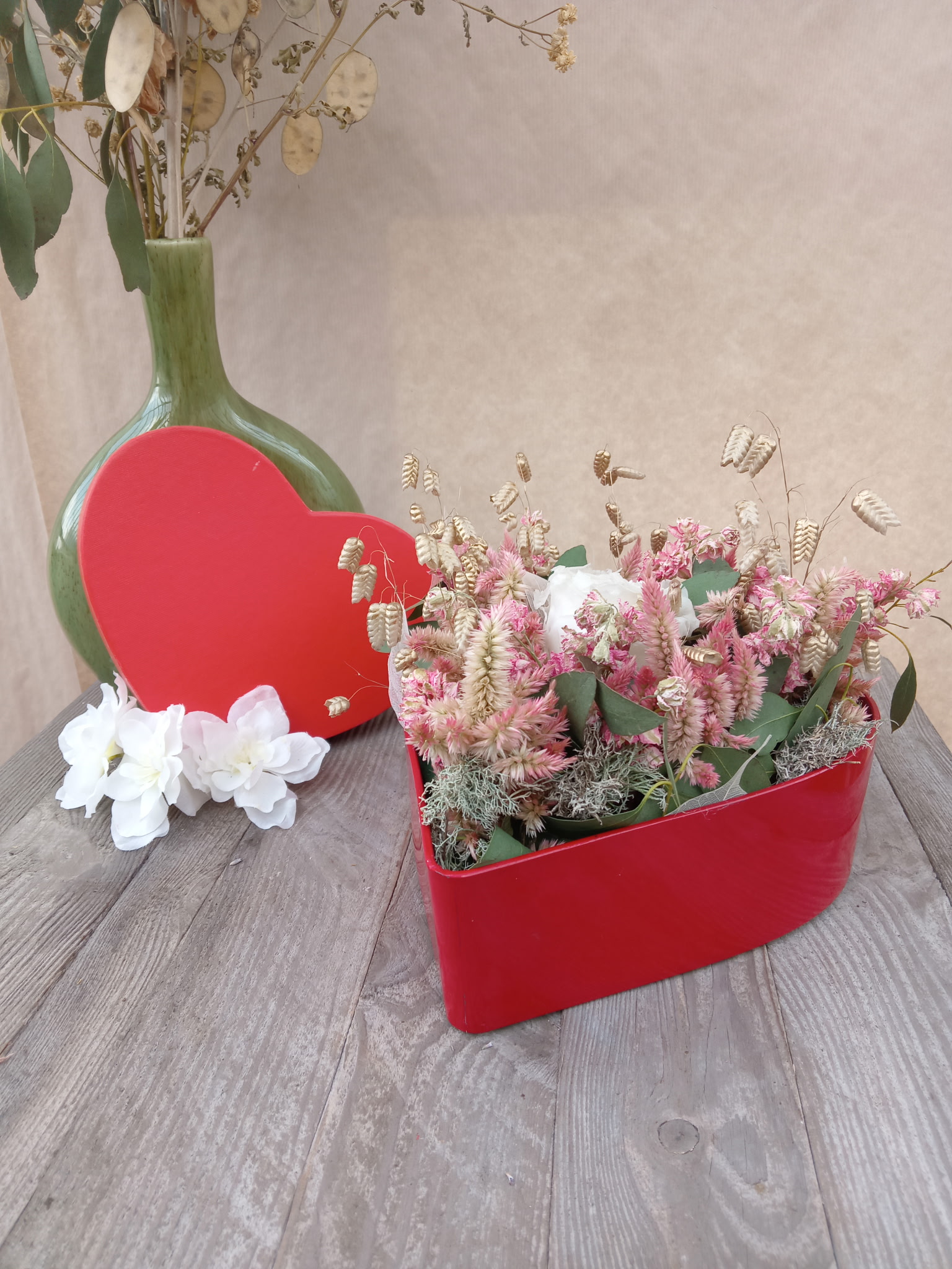 Une très jolie composition de en fleurs séchées (de notre production) avec une rose étenelle au centre, le tout disposé dans une boite en forme de coeur rouge.