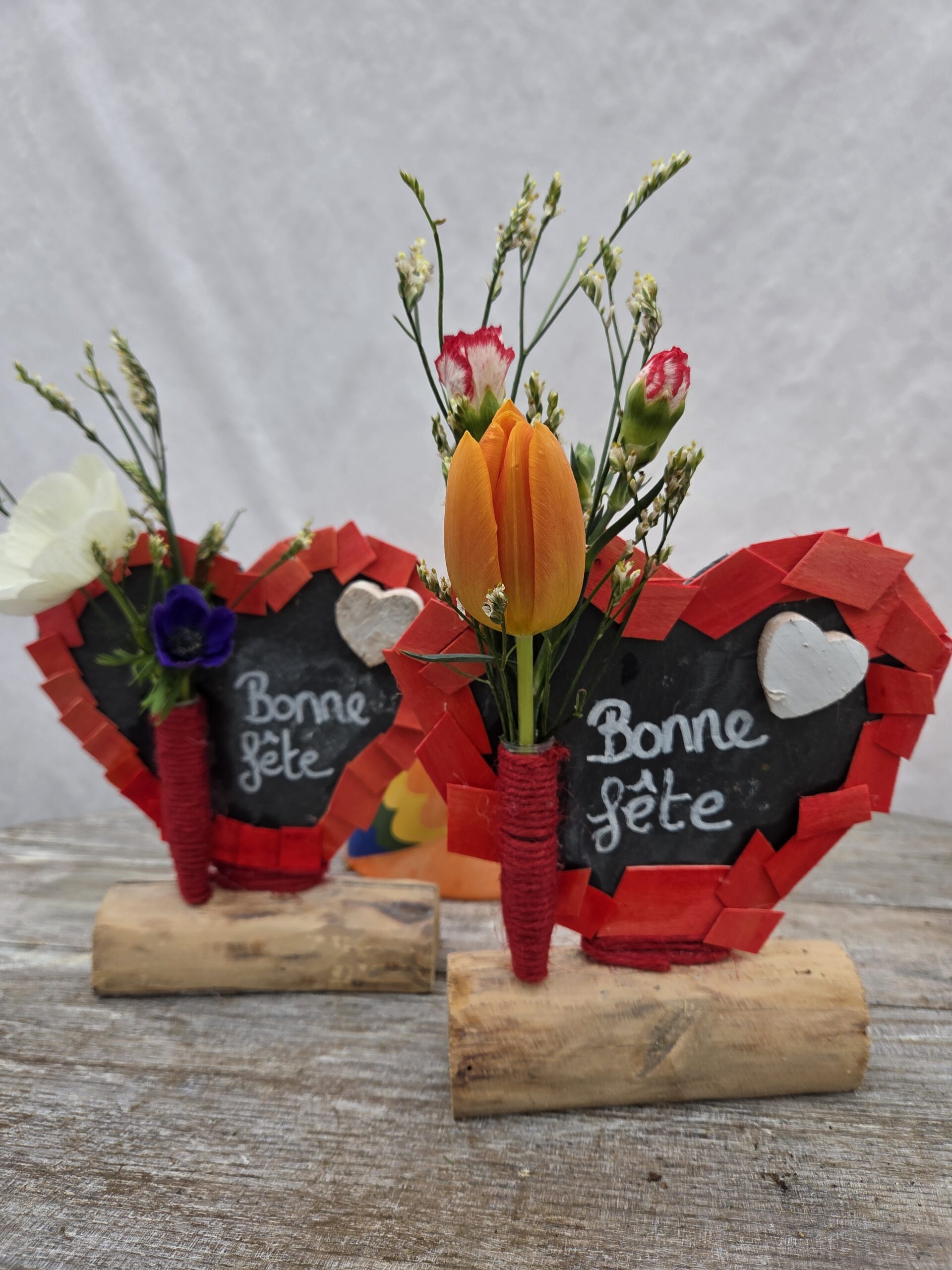Une très jolie ardoise en forme de coeur, montée sur une petite bûche de bois et décorée de fleurette et de petit bois rouge.