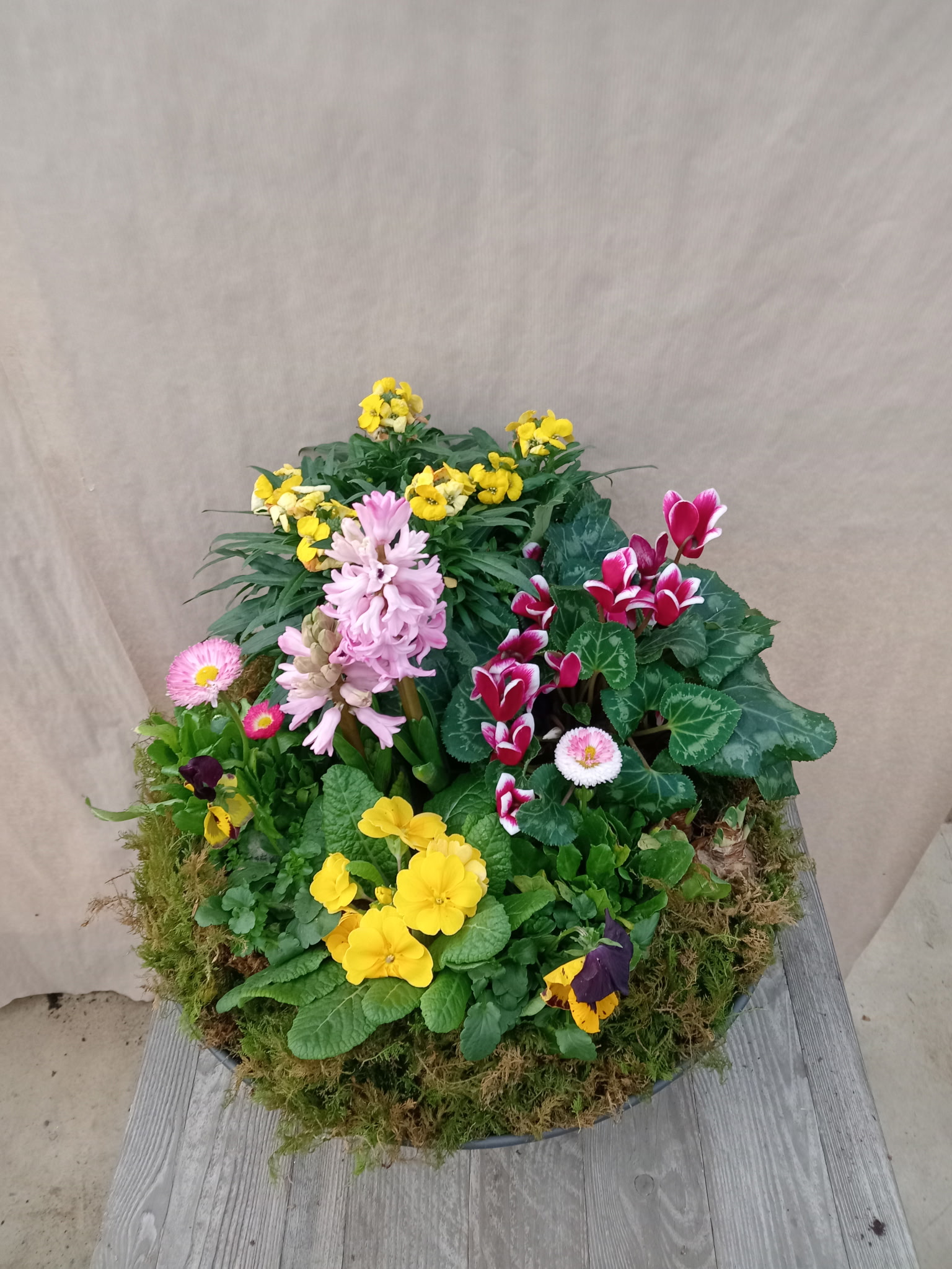 Une belle coupe de plante composée d’une Primevère jaune, d’un Cyclamen rose au bord, de deux Jacynthe roses,, d’une Giroflée jaune, de deux Pâquerette rose et de Pensée violettes et oranges.