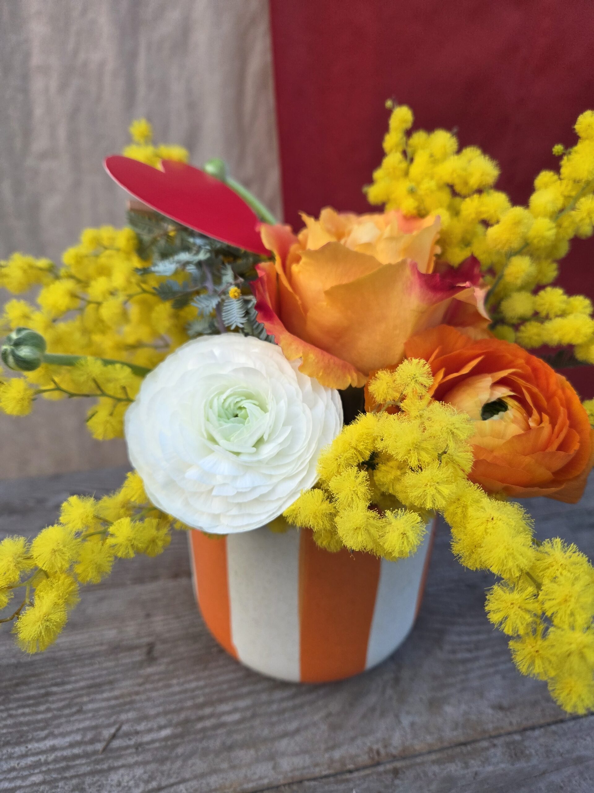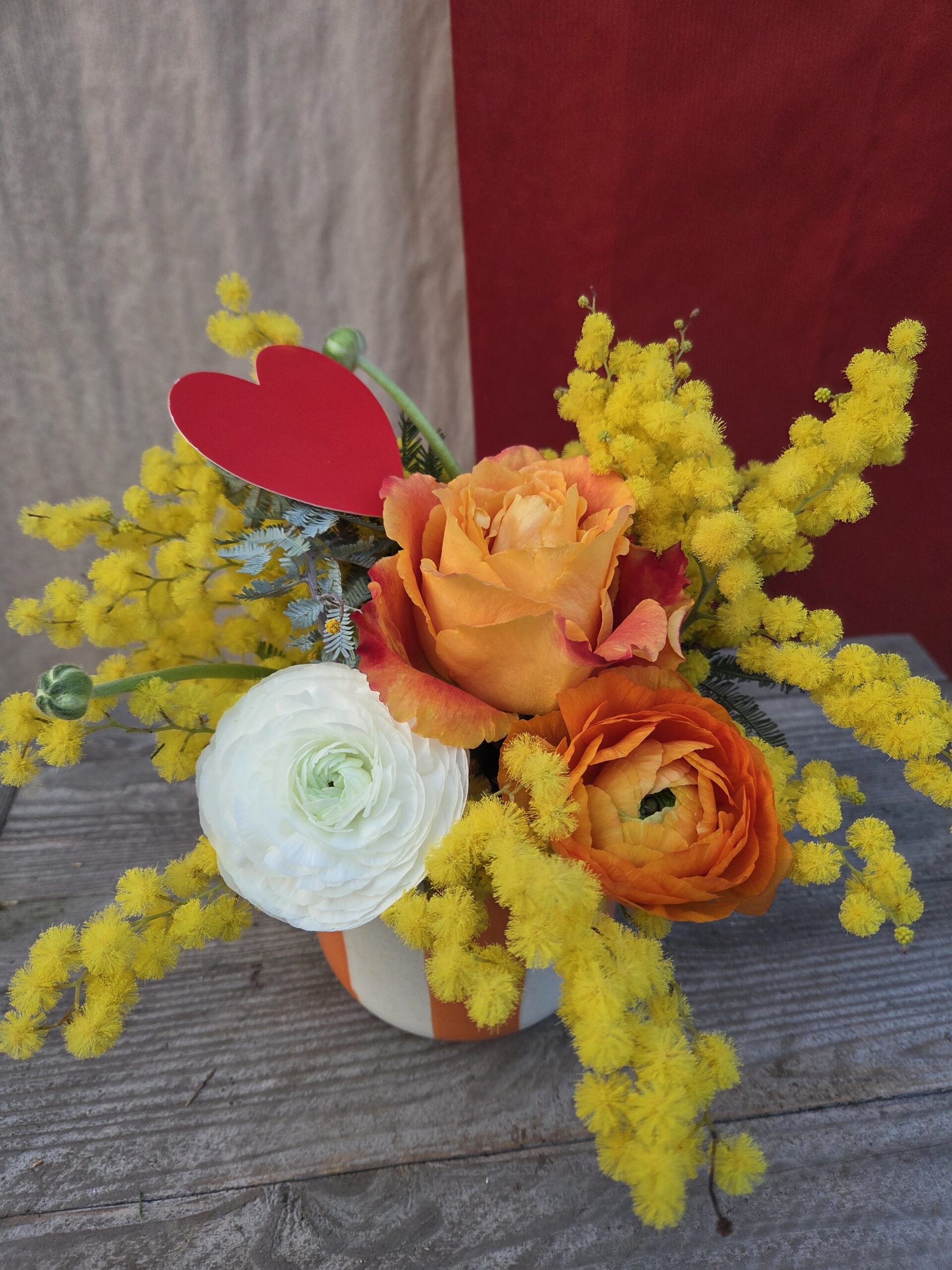 composition en fleurs naturelles , au couleurs jaune orangé.