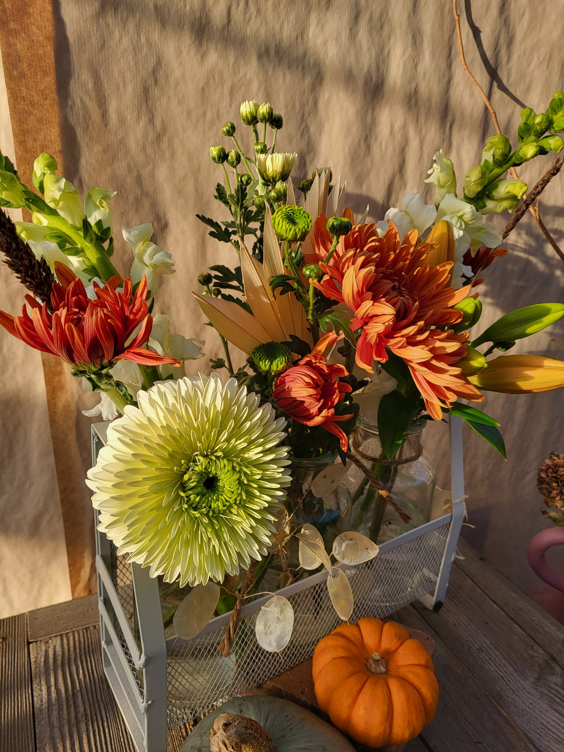 Composition florale avec ses fleurs de saison et couleurs automnal.