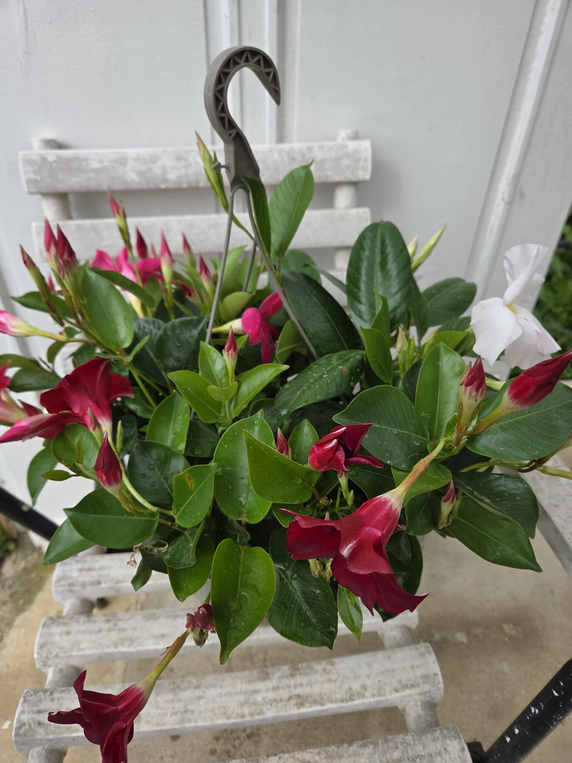 Un superbe Dipladenia tricolore, rouge, blanc et rose.
