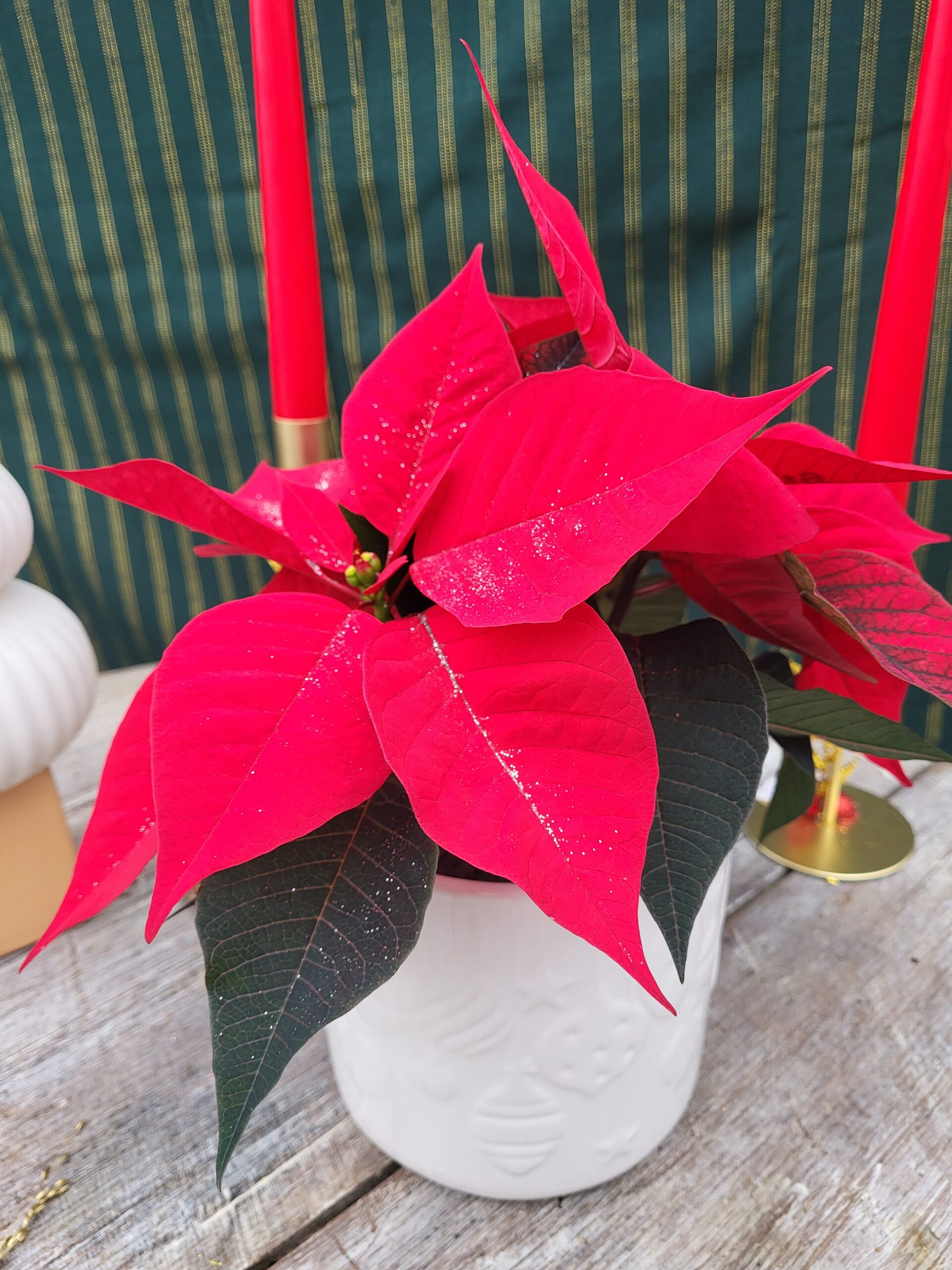 Etoile de Noël ou Poinsettia rouge aavec son cache pot balnc en céramique.
