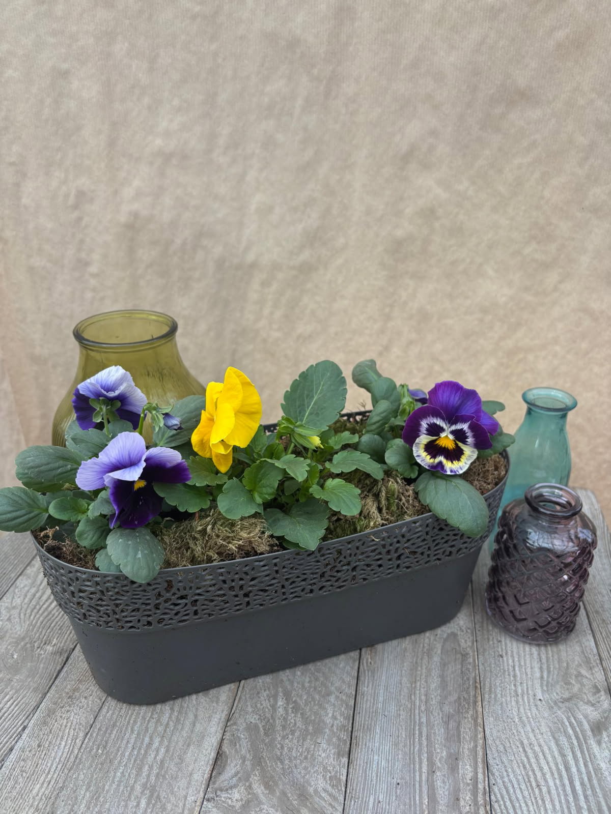 Une jolie petite jardinière de Cornutas violettes et jaunes.