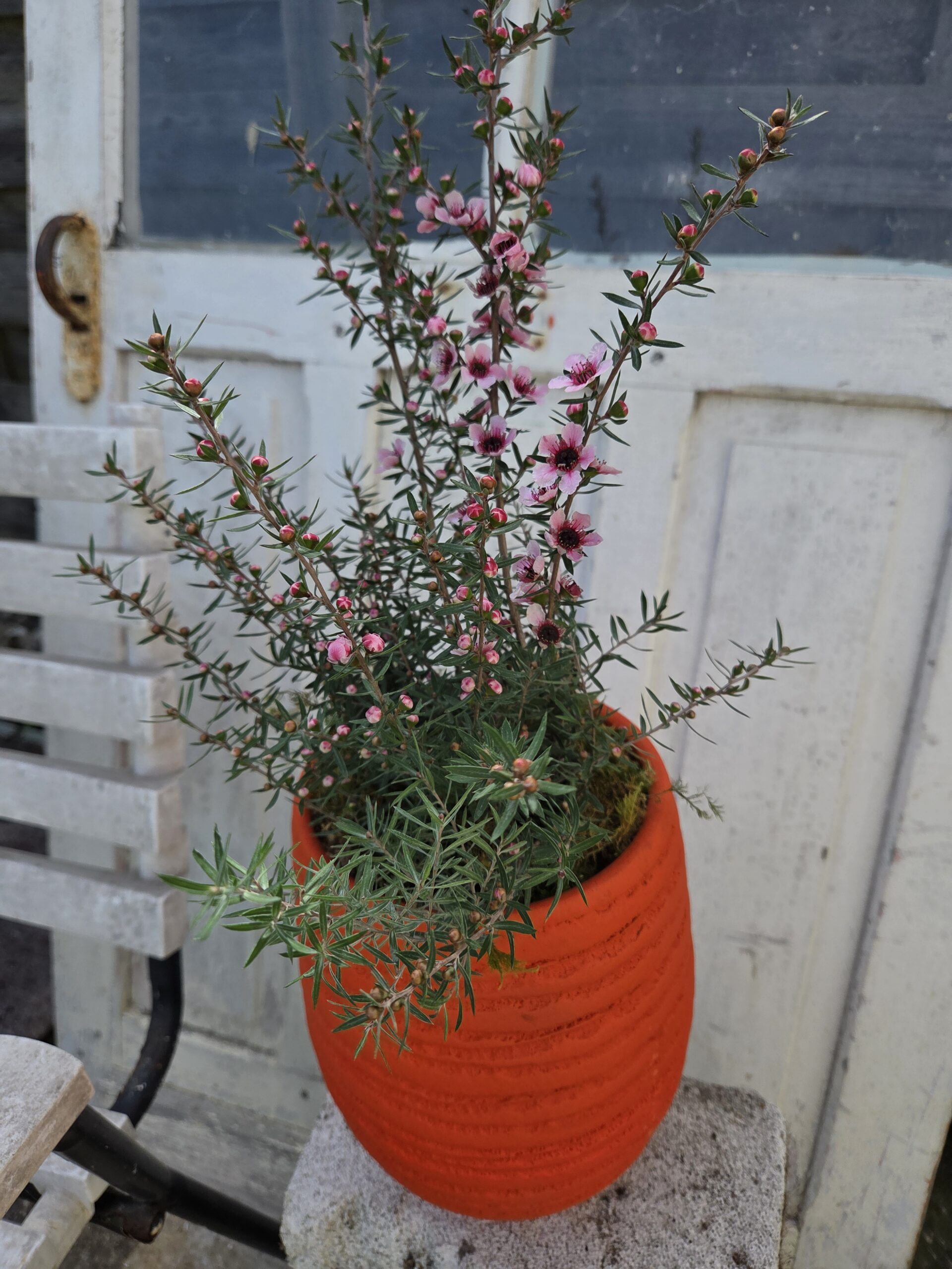 Un superbe Leptospermum rose et son pot orange « flashi ».