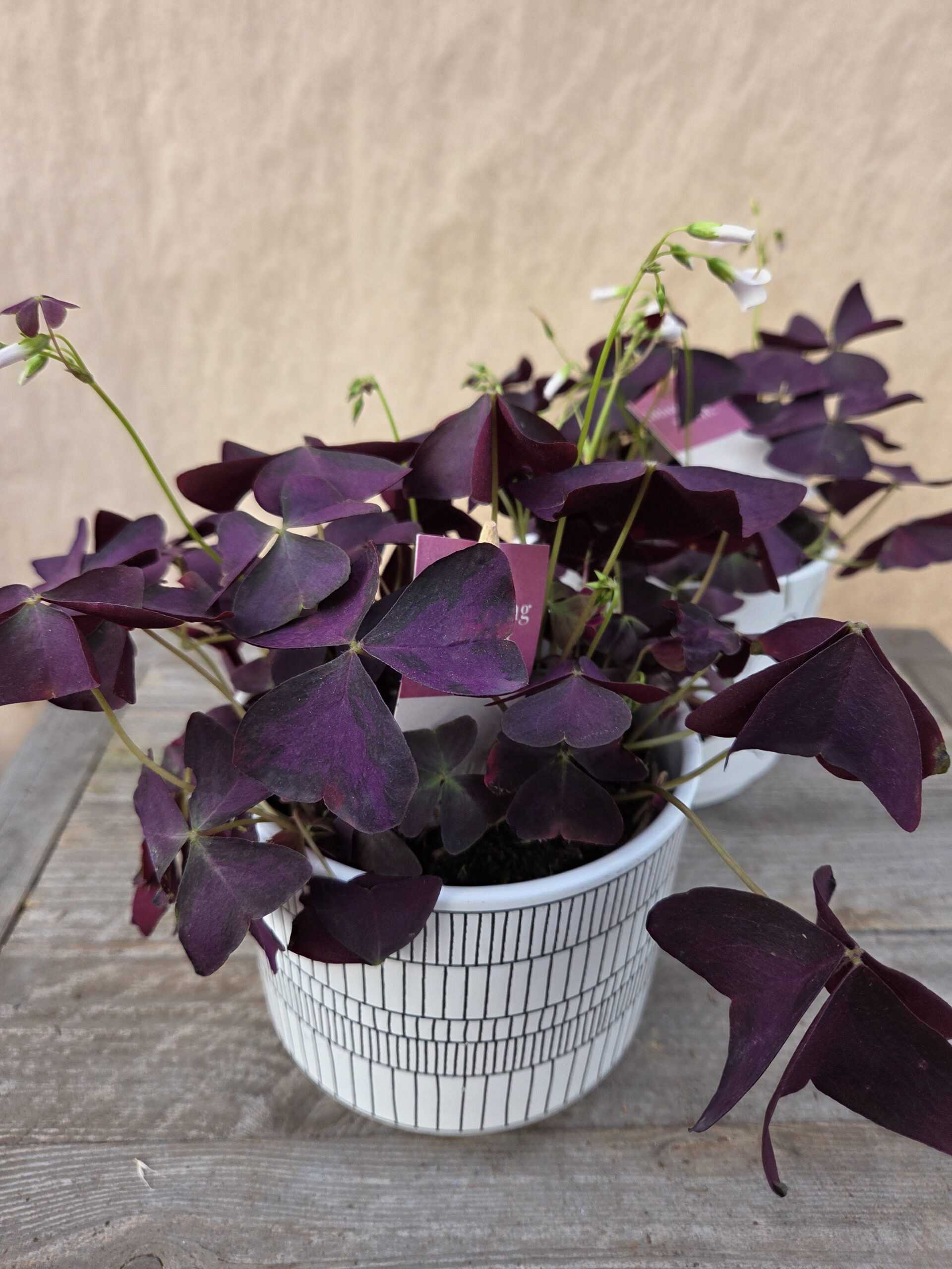 Un superbe Oxalis violet, idéal pour colorer un intérieur, et son cache pot en céramique blanc et noir.
