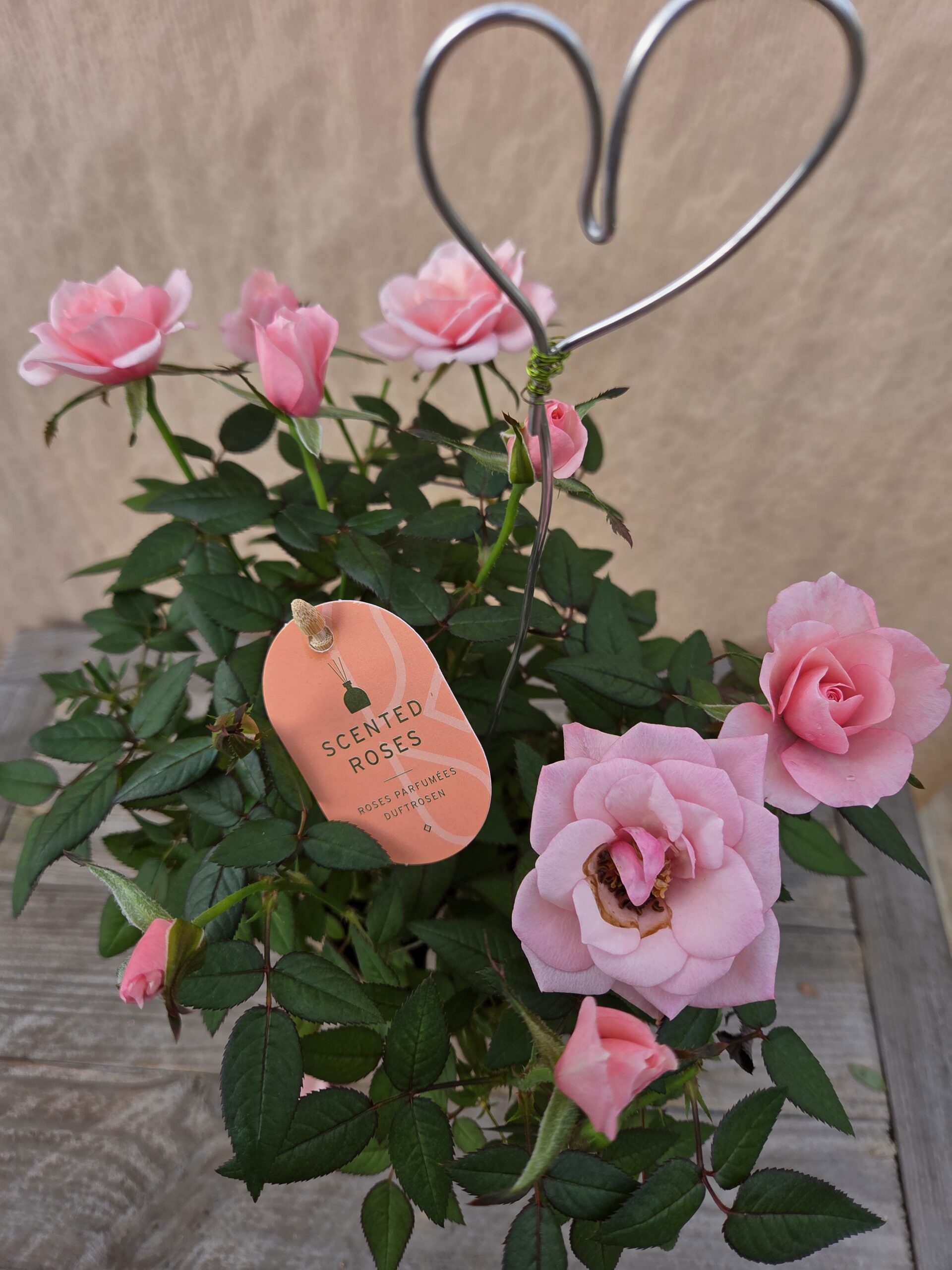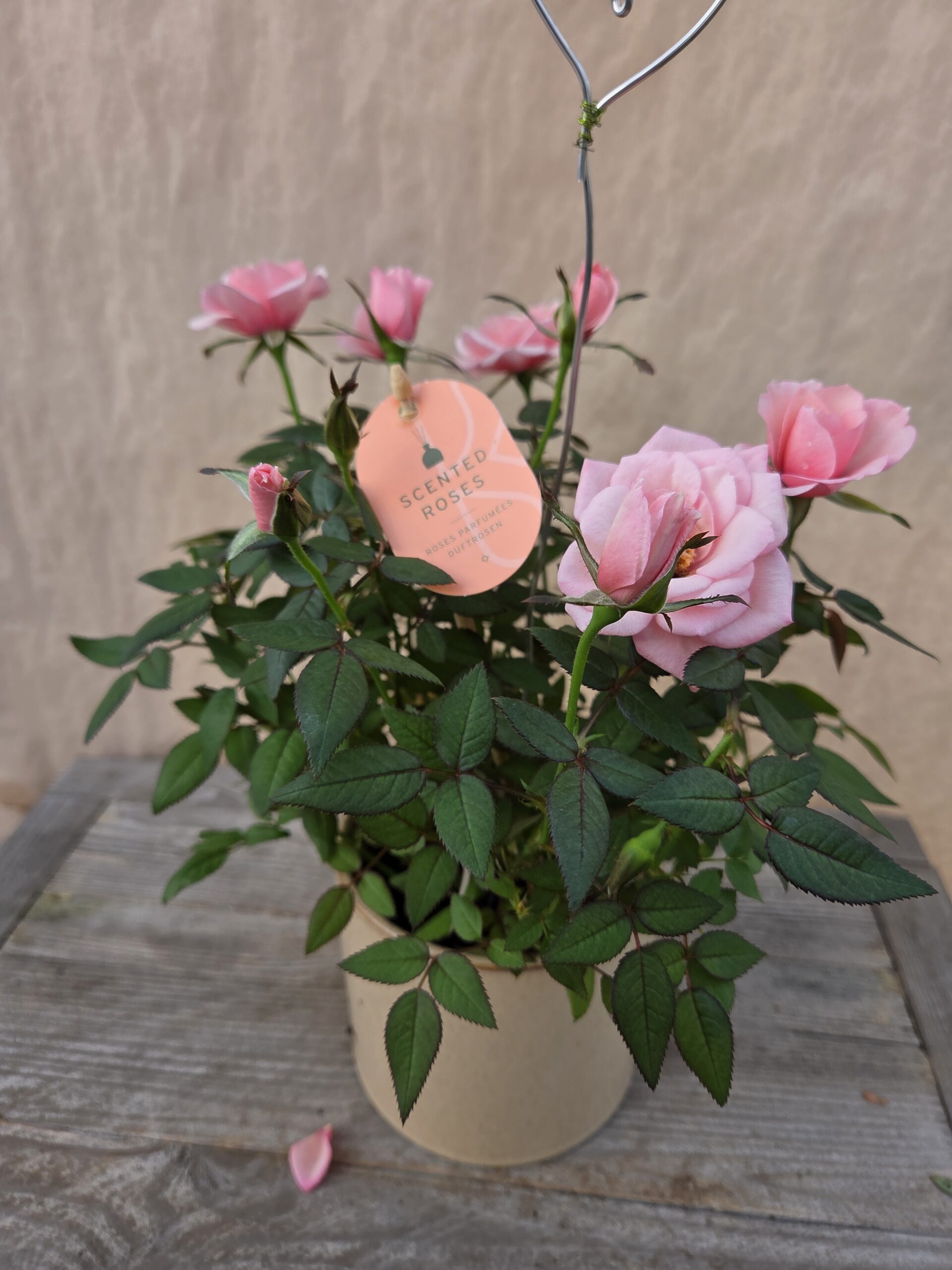 Un très joli Rosier rose pastel et son cache pot en terre cuite vernis.