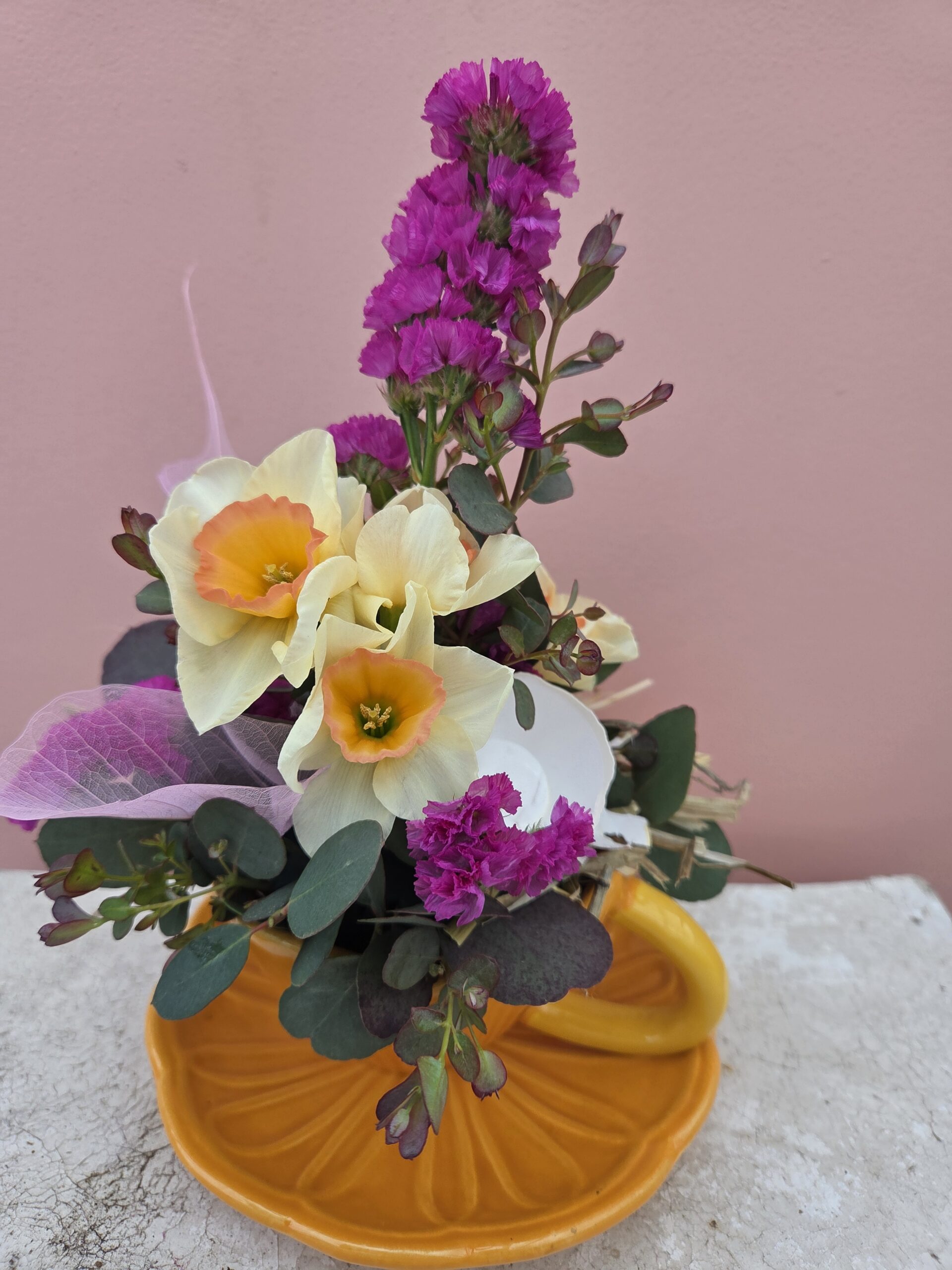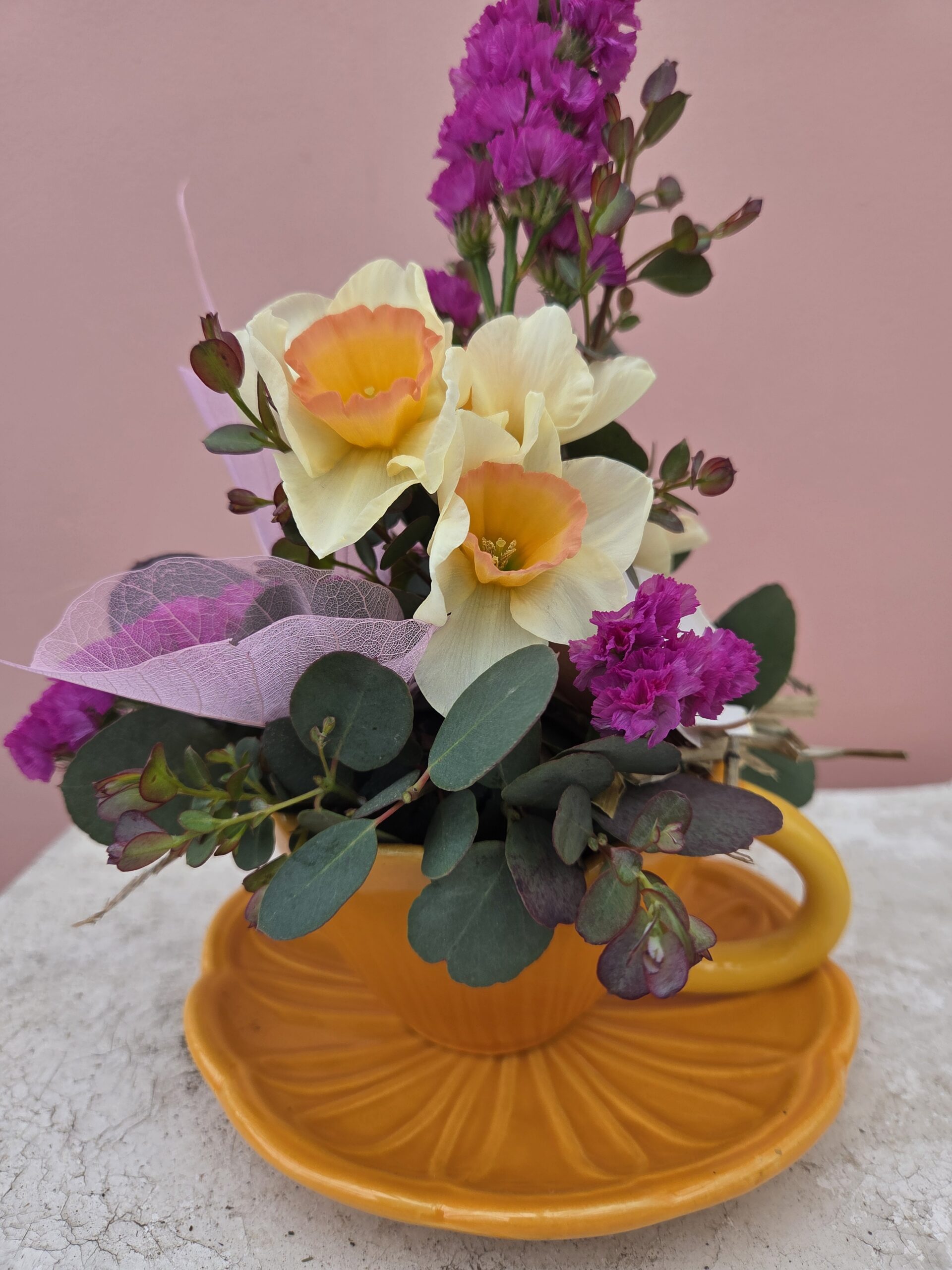 Tasse fleurie composée de fleurs coupées, choix de couleurs au choix selon vos gouts.