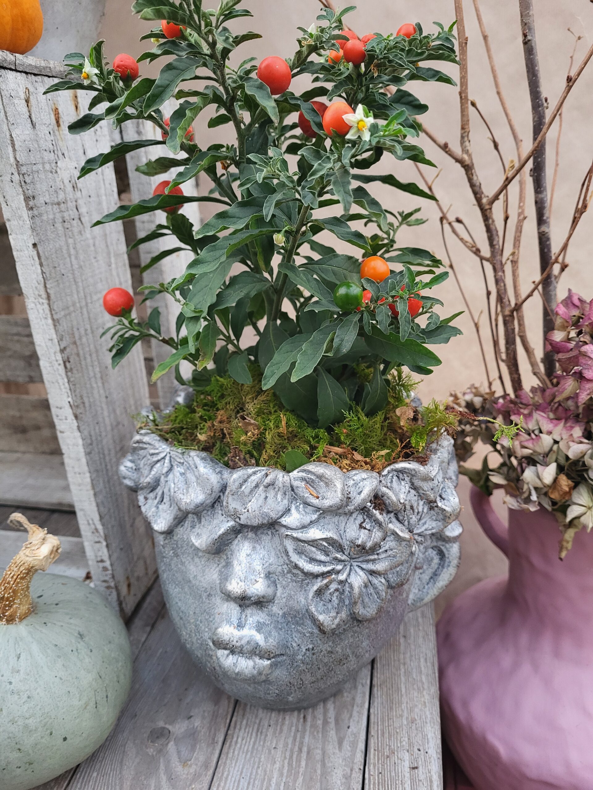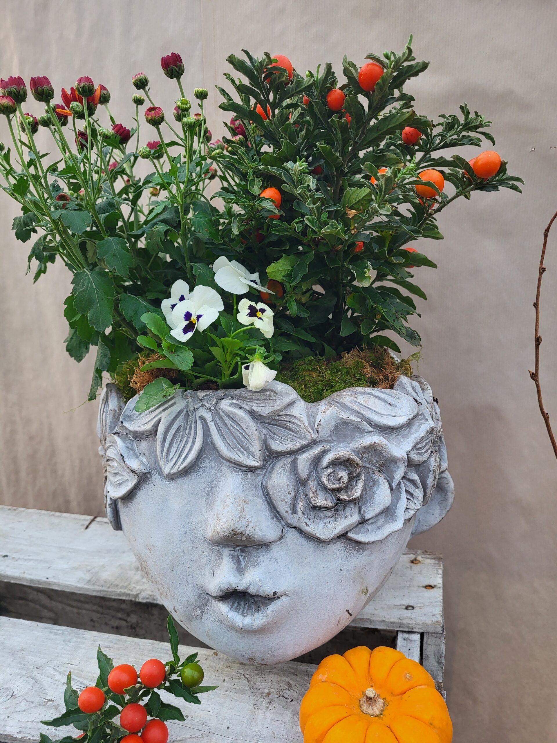 La tête en béton, tête bisous avec ses plantes de saison.