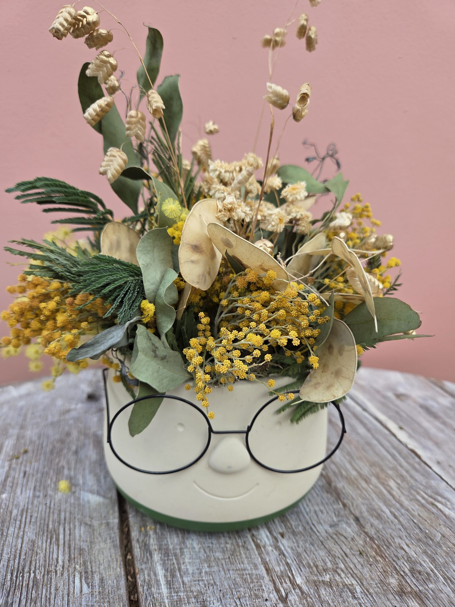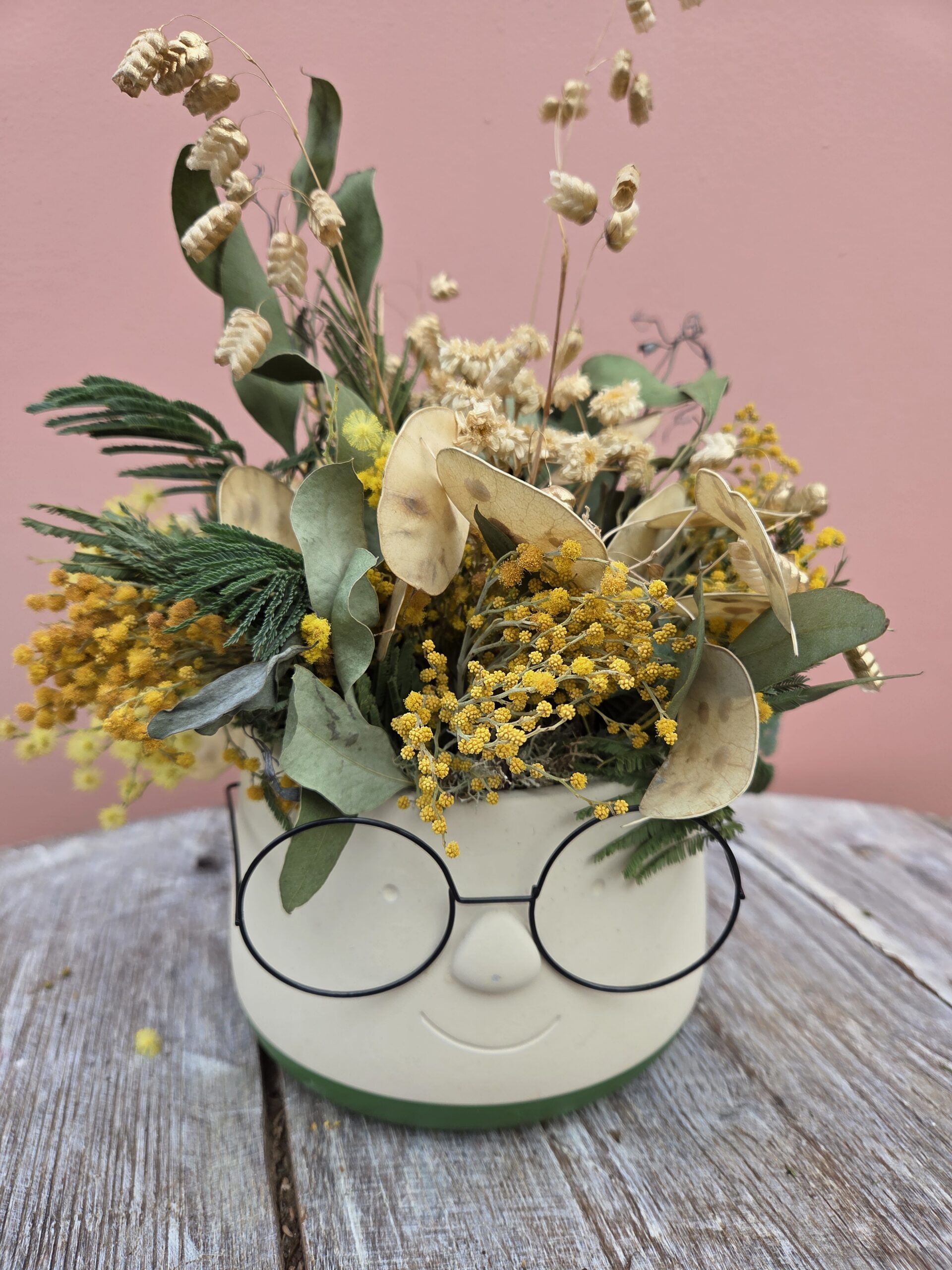 Cache pot lunettes avec ses fleurs séchées de Montenay, 100% LOCALES !