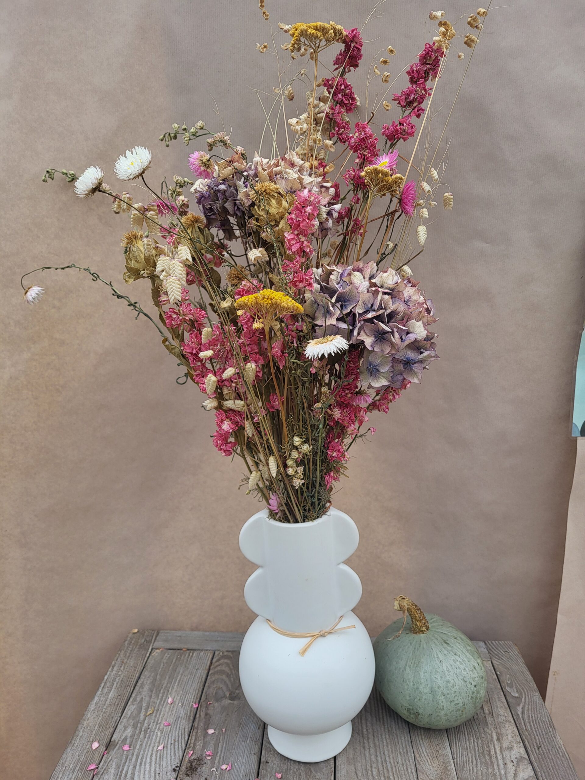 Bouquet de fleurs séchées dans les tons rose,violine, jaune.