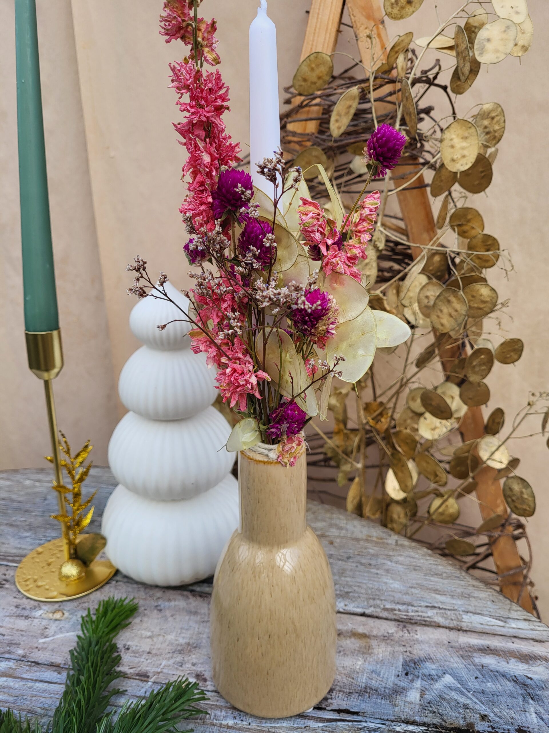 Vase en céramique couleurs caramel avec ses fleurs séchées variés dans les couleurs rose, accompagné de sa bougie blanche.